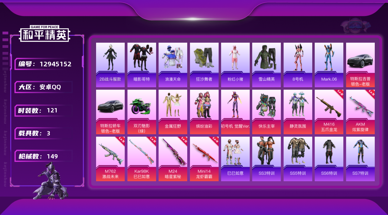 [12945152]【暑期末清货/特价急出/永久包赔】:安卓 手Q-5粉装-7特效枪-3载具-5.2w热力值-4印记-121套装-149枪皮【热门品类】:角色-2B战斗服款【稀有载具】:特斯拉Model 3(冷光银),特斯拉Model X(冷光银),双人摩托-双刃魅影(绿)【特效枪等级】:AKM-炫紫旋律(五级),M416-五爪金龙(六级),M762-激战未来(五级),Kar98K-巳巳如意(五级),M24-暗星紫秘(五级),Mini14-龙虾霸霸(四级)【优质套装】:粉装-快乐主宰,粉装-金属狂野,粉装-静灵氛围,粉装-缤纷油彩,角色-初号机 觉醒Ver.【优质飞行器】:炫紫旋律飞行器