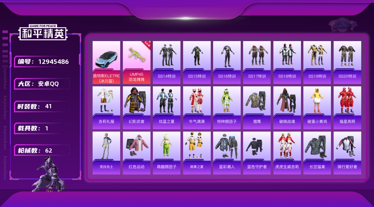[12945486]【暑期末清货/特价急出/永久包赔】:安卓 手Q-1特效枪-1载具-1.9w热力值-1印记-41套装-62枪皮【稀有载具】:路特斯ELETRE(冰川蓝)【特效枪等级】:UMP45-恐龙拽拽(四级)