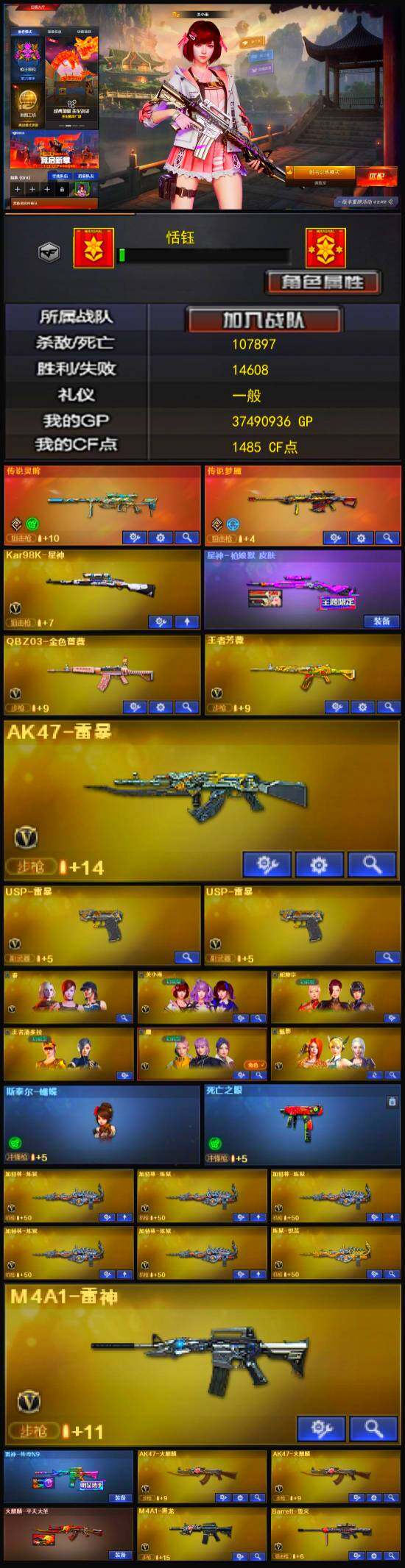 【热门武器】:传说梦魇,传说灵眸,QBZ03-金色蔷薇,金色蔷薇-古蛇迷踪,修罗-古蛇迷踪,死亡之眼,Kar98K-星神,加特林-炼狱*5,斯泰尔-蝴蝶,USP-雷暴*2,沙鹰-修罗*2
