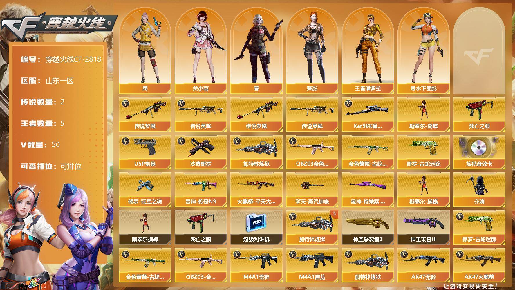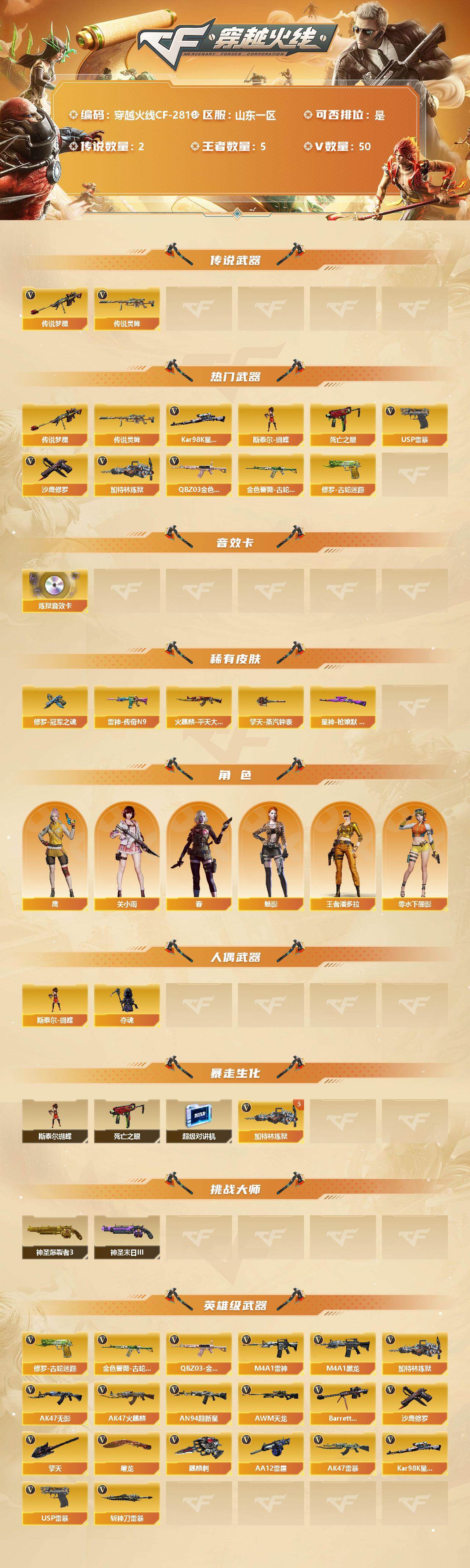 [12945911]山东一区-50V-5王者-0炫金 【传说武器】:传说梦魇,传说灵眸 【热门武器】:传说梦魇,传说灵眸,QBZ03-金色蔷薇,金色蔷薇-古蛇迷踪,修罗-古蛇迷踪,死亡之眼,Kar98K-星神,加特林-炼狱*5,斯泰尔-蝴蝶,USP-雷暴*2,沙鹰-修罗*2 【音效卡】:加特林-炼狱音效卡 【稀有皮肤】:星神-枪娘默 皮肤,雷神-传奇N9,火麒麟-平天大圣,修罗-冠军之魂*2,擎天-蒸汽钟表 皮肤 【角色】:王者潘多拉,零-水下丽影,魅影,春,鹰,关小雨 【人偶武器】:斯泰尔-蝴蝶,夺魂 【暴走生化】:斯泰尔-蝴蝶,死亡之眼,超级对讲机 【挑战大师】:神圣爆裂者III,神圣爆裂者-末日III 【英雄级武器】:AK47-雷暴,USP-雷暴*2,斩神刀-雷暴,QBZ03-金色蔷薇,金色蔷薇-古蛇迷踪,M4A1-雷神,M4A1-黑龙,加特林-炼狱*5,AK47-无影,AK47-火麒麟*2,AN94-超新星,AWM-天龙,Barrett-毁灭,AA-12-雷霆,Kar98K-星神,修罗-古蛇迷踪,沙鹰-修罗*2,麒麟刺,擎天,屠龙 【特殊枪械】:蝴蝶斯泰尔+0烈龙,5炼狱,1蝴蝶斯泰尔