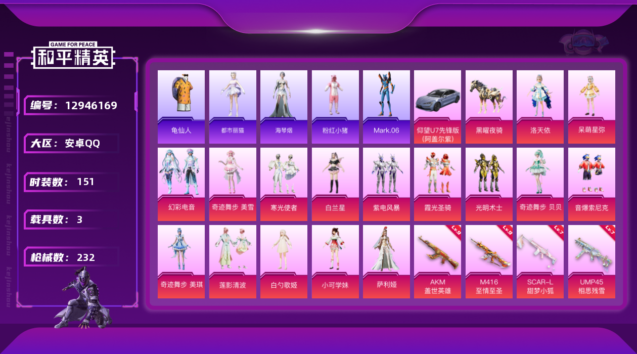 - PX_2090993- 苹果手Q-8王牌印记-5粉装-3特效枪-0载具-53610热力值-129套装-168枪皮-3卓越印记-2传奇印记 【5粉装】,梦幻火箭,宝贝奶油派,智能音符,圣堂之誓,垂柳戏鸭 【3特效枪】SCAR-L-锦绣绵绵-5级 M416-风花雪月-7级 M249-彩虹甜喵-7级 【4稀有紫装】,雪山精英,小丑鱼,龟仙人,金羽特工, 【129稀有时装】,SS31特训,SS33特训,