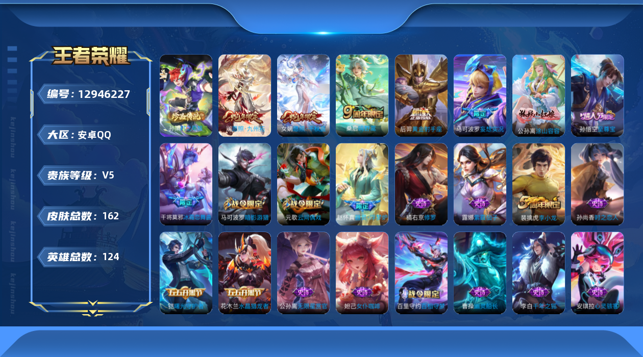 [12946227]【特价急出/详情看图】:安卓Q-V5-最强王者段位-124英雄-162皮肤-1珍品传说-5传说-49史诗