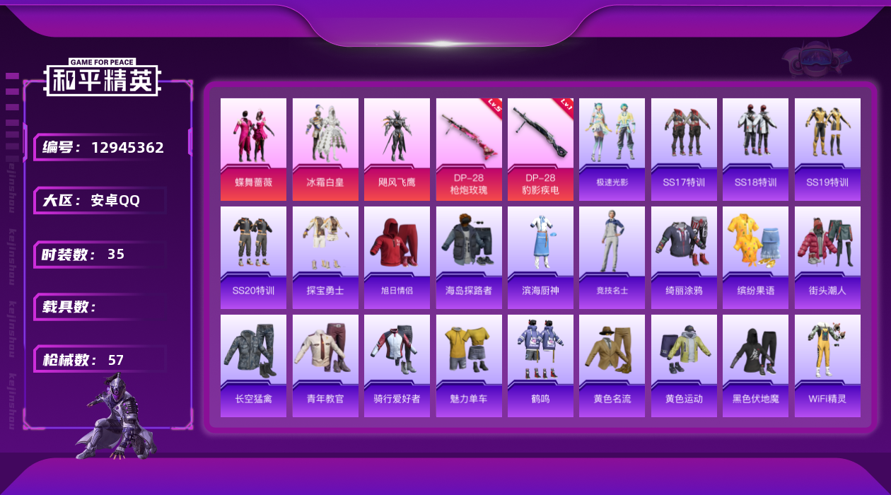 [12945362]【暑期末清货/特价急出/永久包赔】:安卓 手Q-3粉装-2特效枪-1.3w热力值-4印记-35套装-57枪皮【特效枪等级】:DP-28-枪炮玫瑰(五级),DP-28-豹影疾电(一级)【优质套装】:粉装-冰霜白皇,粉装-飓风飞鹰,粉装-蝶舞蔷薇