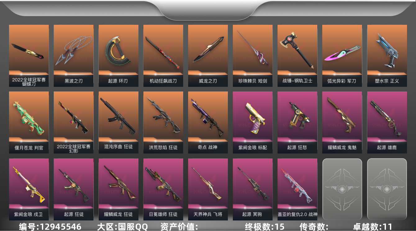 [12945546]皮肤资产43000/【套装】:2022全球冠军赛套装,耀鳞威龙套装,起源套装 【英雄】:幻棱,炼狱,维斯,暮蝶,钛狐,壹决,铁臂,捷风,雷兹,幽影,不死鸟,贤者,猎枭,蝰蛇,零,芮娜,奇乐,尚勃勒,霓虹,斯凯,夜露,星礈,K/O,海神,盖可,黑梦,钢锁【近战 武器】:近战武器-2022全球冠军赛 蝴蝶刀,近战武器-黑波之刃,近战武器-威龙之刃,近战武器-珍珠棘贝 短剑,近战武器-钢轨卫士 战锤,近战武器-弧光异彩 军刀,近战武器-机动狂飙 战刀,近战武器-起源 环刃 【狂徒】:狂徒-洪荒怒焰,狂徒-混沌序曲,狂徒-起源,狂徒-日冕雄师,狂徒-耀鳞威龙,狂徒-钢轨卫士,狂徒-弧光异彩 【幻影】:幻影-2022全球冠军赛,幻影-噬源兽防卫工程,幻影-珍珠棘贝,幻影-战术小伙伴 【戍卫】:戍卫-紫阙金琅,戍卫-钢轨卫士,戍卫-珍珠棘贝,戍卫-彩梦之城,戍卫-萌彩剪影 【獠犬】:獠犬-弧光异彩,獠犬-复古浪潮,獠犬-胡桃狂想,獠犬-战术小伙伴 【冥驹】:冥驹-起源,冥驹-复古浪潮,冥驹-胡桃狂想 【飞将】:飞将-天界神兵,飞将-沙尘幻旅,飞将-信手涂鸦,飞将-光导纤维 【莽侠】:莽侠-深海水族 【战神】:战神-奇点,战神-盖亚的复仇//2.0,战神-萌彩剪影,战神-深海水族 【奥丁】:奥丁-巨神铁甲,奥丁-信手涂鸦,奥丁-战术小伙伴 【判官】:判官-偃月苍龙,判官-萌彩剪影 【雄鹿】:雄鹿-起源,雄鹿-彩梦之城,雄鹿-复古浪潮 【骇灵】:骇灵-沙尘幻旅,骇灵-珍珠棘贝,骇灵-光导纤维,骇灵-信手涂鸦 【蜂刺】:蜂刺-弧光异彩,蜂刺-胡桃狂想,蜂刺-深海水族,蜂刺-战术小伙伴 【标配】:标配-紫阙金琅,标配-浪漫雪国,标配-彩梦之城,标配-光导纤维 【正义】:正义-塑水宗,正义-多边形,正义-复古浪潮,正义-纳米打击 【鬼魅】:鬼魅-耀鳞威龙,鬼魅-光导纤维,鬼魅-胡桃狂想,鬼魅-信手涂鸦 【狂怒】:狂怒-起源,狂怒-钢轨卫士,狂怒-珍珠棘贝,狂怒-萌彩剪影 【短炮】:短炮-钢轨卫士,短炮-弧光异彩,短炮-深海水族 【卡面】:终章:激斗汉堡 卡面,进入射程 卡面,《双城之战》拥抱 卡面,精灵大战 卡面,欢迎来到底城 卡面,南瓜盛典 卡面,超限闪存 卡面,梦幻奶茶 卡面,源能反应 卡面,打造专属狂徒 卡面,零点嗅探设计图 卡面,表象之下 卡面,虹吸式咖啡壶 卡面,源能者美容