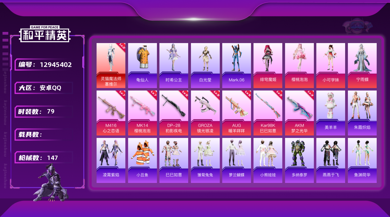 - [11523148]4粉装 6特效枪 1载具 14印记 可二次 可修改实名 身法装备:暗影哥特(红眼罩) 优质装备:路特斯EVIJA(星际黄),AKM炫紫旋律,M416五爪金龙,奇异狩猎者,金风玉露,彗云及圣,AUG星之彼岸,七级AUG-星之彼岸,七级AKM-炫紫旋律,智耀战神,AMR-智耀战神,Kar98K-巳巳如意 热门装扮:筑梦精灵,神秘黑猫,仓鼠灰灰,鹰眼刺客,浪漫波比,好奇恐龙 稀有枪皮:DP-28-豹影疾电 六级特效枪:六级AMR-智耀战神 五级特效枪:五级Kar98K-巳巳如意,五级DP-28-豹影疾电 四级特效枪:四级M416-五爪金龙 紫色装扮:娇憨猪猪,萌趣咩咩,SS21特训,SS31特训套装,SS5特训,冰川特警,冷焰舞者,凛冬战士,刚毅裁决者,北国孤狼,旭日情侣,极速光影,SS30特训套装,SS33特训套装,顶瓜瓜,SS20特训,时空追击者,暴风机械师,SS16特训,冰爽风暴,SS13特训,骁骑迪迦,SS14特训,音速流光,SS19特训,军刀雅典娜,甜心亚梦,虚音幻奏,瑞龙福将,团圆交子,SS17特训,SS18特训,智慧隐士,都市漫游者,都市魅力,酷潮明星,长空猛禽,雨林探路者,雪山征服者,雪山精英,霓虹极客,霓虹街区,青春校园,缤纷果语,耀眼新星,荣耀,蓝彩潮人,蓝色运动,虎虎生威吉莉,街头潮人,跃动心情,魅力单车,黎明保卫者,黑色伏地魔,龙的传人,沙漠毒蛇,极地朋克,极速红龙,格斗先锋,棕色飞行服,沙漠兵团,暗金炫舞,海岛探路者,深蓝色名流,清新柠檬,滨海假日,圣诞大吉,坚韧舞者,夏日音浪,幻世战舞者,探宝勇士,滨海厨神,绮丽涂鸦,疯狂小兔子,白熊同盟,白色伏地魔,甜蜜告白,福星高照,竞技勇士朋克,竞技达人朋克,甜蜜熊情侣,潮流先锋,牛气冲天,灰色格斗者,热血青春,熔岩使者,牛气满满,特战装甲,SS29特训,星途旅人,光矢逐梦,异域银装,鱼渊荷华,玉兔迎春,燕燕于飞,巳巳如意,烈火街头,森林游猎者,竞技名士,暗影哥特(红眼罩),街头风暴,惊鸿侠骨,SS24特训(SS24特训套装),SS25特训,锦衣飞扬,粉红小猪,金羽特工,小丑鱼,SS26特训,智谋强哥,精神漫游,炽焰拳师,格斗专家,SS6特训,银河圣歌,闪耀星光,黑色刀锋,核芯基因,拳皇97八神庵,SS7特训,人鱼之吻,深蓝冒险家,迷域探索者,精密机核,摩艾涂鸦,SS8特训,大橘大利,SS12特训,众