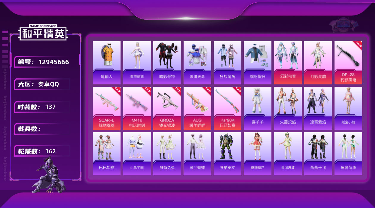 - [13290517]安卓 手Q-5粉装-4特效枪-1载具-2粉色飞行器-4.9w热力值-4王牌印记-106套装-167枪皮【热门品类】:粉装-音爆索尼克,角色-军刀雅典娜,套装-龟仙人,角色-Mark.06【粉色载具】:辉羽雀灵自行车【粉色套装】:角色-复仇流浪者,粉装-音爆索尼克,角色-圣堂之誓,粉装-雪月幻音,粉装-幻彩电音【粉色枪皮等级】:AKM-绿萝繁花(五级),AKS-74U-星穹咏叹调(七级),Kar98K-巳巳如意(五级),MG3-辉羽雀灵(三级)【粉色飞行器】:幽焰列车飞行器,雀灵庇佑飞行器