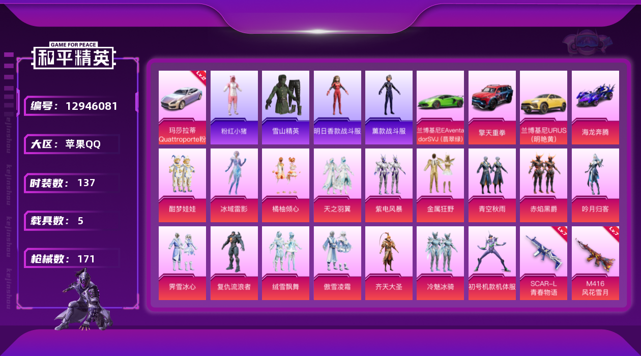 [12946081]【暑期末清货/特价急出/永久包赔】:苹果 手Q-16粉装-6特效枪-5载具-6.7w热力值-9印记-137套装-171枪皮【稀有载具】:兰博基尼Aventador SVJ(翡翠绿),兰博基尼URUS(明艳黄),玛莎拉蒂Quattroporte(幻星粉),擎天重拳,海龙奔腾【热门品类】:套装-奇异狩猎者,角色-军刀雅典娜,套装-动感兔斯基人偶服【稀有载具等级】:玛莎拉蒂Quattroporte(幻星粉)(二级)【特效枪等级】:M16A4-垂柳戏鸭(一级),SCAR-L-青春物语(七级),M416-风花雪月(七级),M762-冷魅冰骑(七级),Vector-环太平洋(一级),Kar98K-巳巳如意(一级)【优质套装】:粉装-金属狂野,粉装-齐天大圣,粉装-吟月归客,角色-初号机款机体服,粉装-酣梦娃娃,粉装-天之羽翼,粉装-橘柚倾心,粉装-冷魅冰骑,粉装-赤焰黑爵,粉装-紫电风暴,角色-复仇流浪者,粉装-绒雪飘舞,粉装-傲雪凌霜,粉装-霁雪冰心,粉装-青空秋雨,角色-冰域雷影【优质飞行器】:齐天大圣飞行器,天之羽翼飞行器,冠军兔兔飞行器