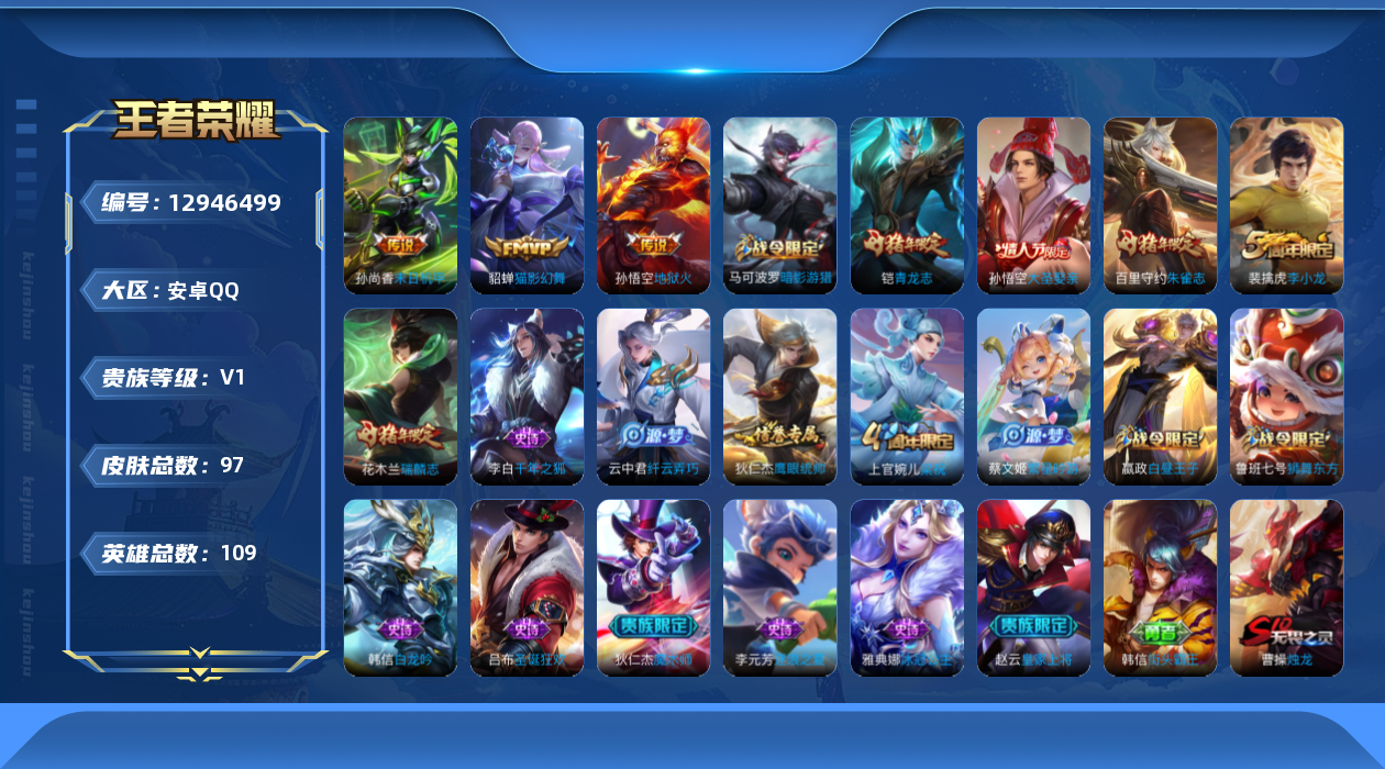 [12946499]【暑期末清货/特价急出/永久包赔/商品详情看图】:安卓Q-V0-荣耀黄金IV段位-109英雄-97皮肤-3传说-19史诗