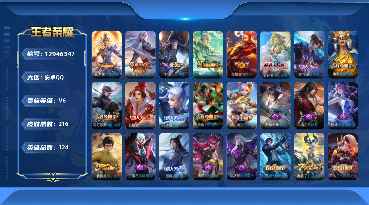 [12946347]安卓Q-V6-至尊星耀IV段位-124英雄-216皮肤-1典藏-4传说-56史诗