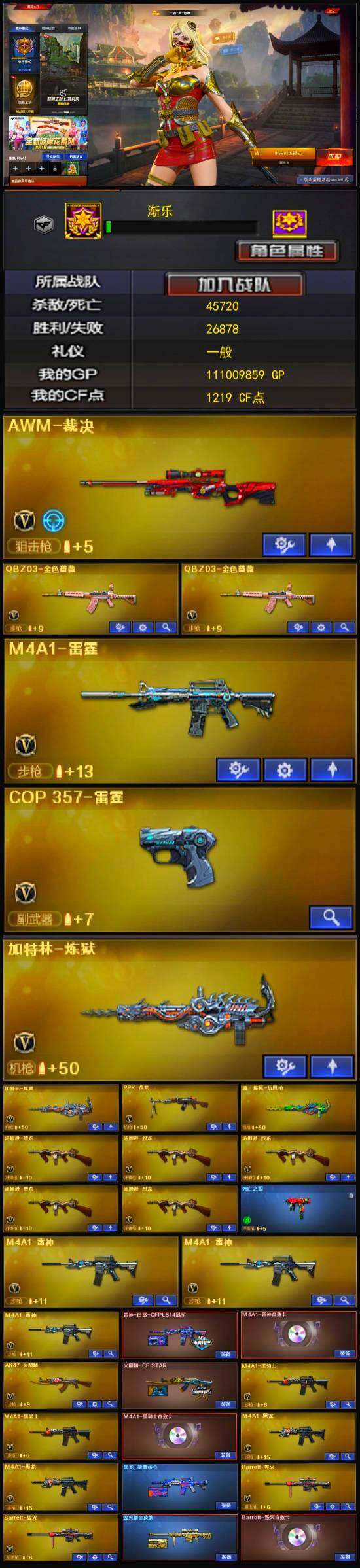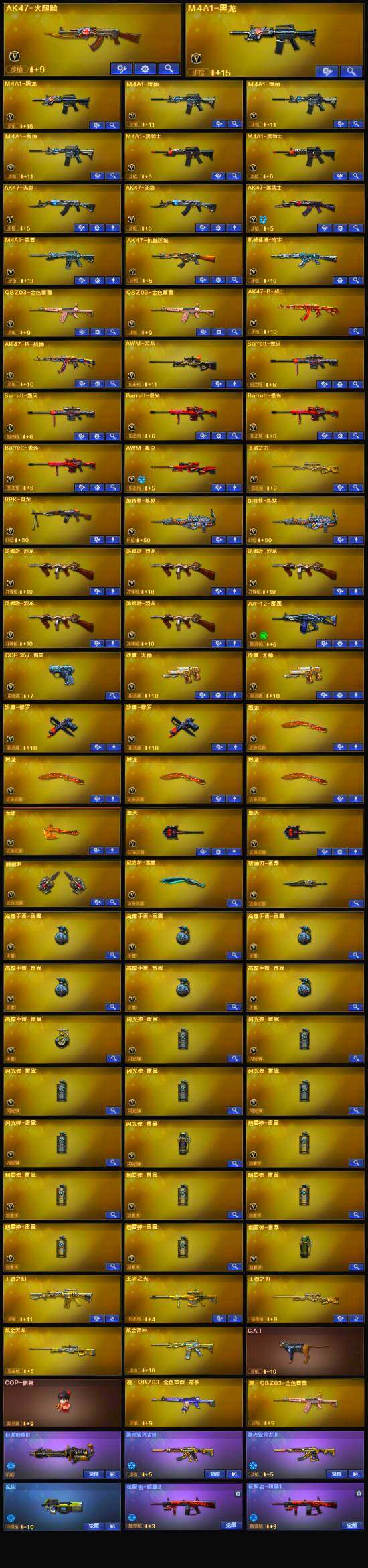 【英雄级武器】:斩神刀-雷暴,M4A1-雷霆,QBZ03-金色蔷薇*2,M4A1-雷神*3,M4A1-黑龙*2,M4A1-黑骑士*2,RPK-盘龙,加特林-炼狱*2,汤姆逊-烈龙*5,AK47-无影*2,AK47-火麒麟,AK47-黑武士,AWM-天龙,Barrett-毁灭*2,Barrett-极光*3,AWM-裁决,AK47-机械迷城,AA-12-雷霆,AK-47-猩红传说*8,AK47-B-战神,M4A1-赤狱骑士,沙鹰-天神*2,沙鹰-修罗*2,麒麟刺,擎天*2,龙啸,屠龙*4