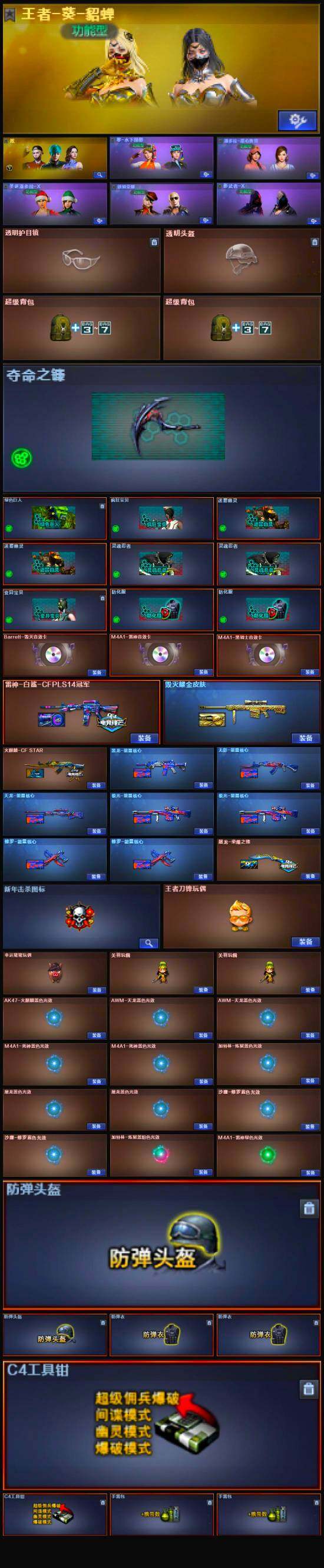 - [13587604]四川一区-35V-10王者-1炫金 【热门武器】:M200-幻神,死亡之眼,荣耀世冠-火麒麟,柯尔特-冠军之特,加特林-炼狱*2,沙鹰-修罗*5 【王者炫金武器】:炫金雷神 【音效卡】:Barrett-毁灭音效卡,Barrett-碧霄极光音效卡 【皮肤】:幻神-曹操 皮肤,裁决-巅峰荣耀 皮肤,雷神-荣耀之魄,雷神-宠儿-2019MVP,AWM-天龙-传奇白鲨,屠龙-春桃 皮肤 【角色】:王者-魅影,暗夜-X,兰-新年限定,猎狐者-追月,灵狐者-X,灵狐者-黄金海岸,龙儿-小淘气,麻雀,曼陀罗-X,潘多拉-X,潘多拉-甜心教官,蛇姬,雪莉杨,雪莉杨-摸金校尉,樱-战斗天使,职业选手 【暴走生化】:死亡之眼,超级对讲机 【英雄级武器】:AK47-火麒麟,M4A1-雷神,M4A1-死神,AK12-天启,AK47-黑鲨,荣耀世冠-火麒麟,AWM-天龙,Barrett-毁灭,Barrett-极光,AWM-裁决,M200-幻神,加特林-炼狱*2,沙鹰-修罗*5,柯尔特-冠军之特,Anaconda-玄豹,屠龙*2,麒麟刺-堕天神,擎天,斩神刀-雷暴,王者之击-觉醒版,高爆手雷-雷霆,高爆手雷-雷暴,高爆手雷-堕天神,闪光弹-雷霆,闪光弹-雷暴,闪光弹-堕天神,闪光弹-雷霆王者-觉醒版*3,烟雾弹-雷暴,烟雾弹-堕天神,烟雾弹-玄豹,烟雾弹-雷霆王者-觉醒版*2,M4A1-赤狱骑士 【道具】:BS战队炫彩背包,CFS限定背包,亚洲杯纪念炫彩背包,女皇终结者-背包,炫彩背包,背包-葫芦兄弟,女皇终结者-魔龙之吻,救世主-黑桃战神,绿色巨人,灵魂忍者*2,变异宝贝,迷雾幽灵*2,夺命之镰,防化服*3,巅峰赛先锋-金色流光,流光-鎏金之域,枪王排位28赛季金色流光,枪王排位29赛季金色流光,EP战队名片,EP战队喷图,EP战队击杀图标,防弹头盔*4,防弹衣*4,C4工具钳*6,手雷包*4 【特殊枪械】:2炼狱