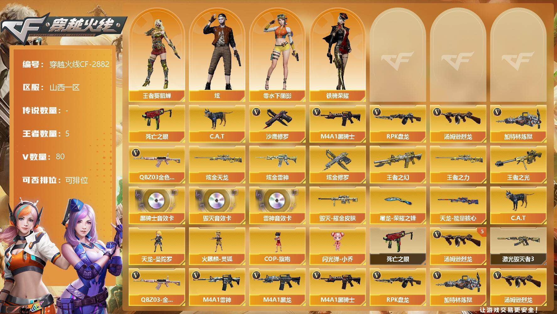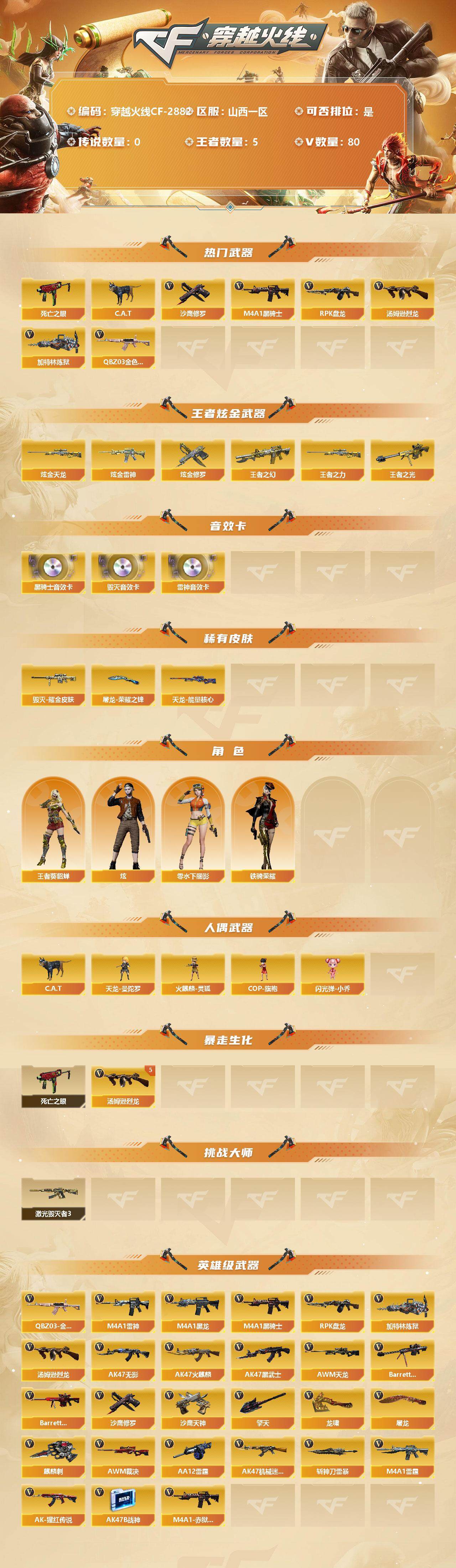 [12946355]山西一区-80V-5王者-4炫金 【热门武器】:QBZ03-金色蔷薇*2,死亡之眼,C.A.T,M4A1-黑骑士*2,汤姆逊-烈龙*5,RPK-盘龙,加特林-炼狱*2,沙鹰-修罗*2 【王者炫金武器】:炫金天龙,炫金雷神,炫金修罗*2,王者之幻,王者之光,王者之力 【音效卡】:M4A1-雷神音效卡,M4A1-黑骑士音效卡,Barrett-毁灭音效卡 【稀有皮肤】:毁灭耀金皮肤,天龙-能量核心,屠龙-荣耀之锋 【角色】:王者-葵-貂蝉,零-水下丽影,炫,铁骑荣耀 【人偶武器】:天龙-曼陀罗,火麒麟-灵狐,COP-旗袍,C.A.T,闪光弹-小乔 【暴走生化】:死亡之眼 【挑战大师】:激光毁灭者III*2 【英雄级武器】:斩神刀-雷暴,M4A1-雷霆,QBZ03-金色蔷薇*2,M4A1-雷神*3,M4A1-黑龙*2,M4A1-黑骑士*2,RPK-盘龙,加特林-炼狱*2,汤姆逊-烈龙*5,AK47-无影*2,AK47-火麒麟,AK47-黑武士,AWM-天龙,Barrett-毁灭*2,Barrett-极光*3,AWM-裁决,AK47-机械迷城,AA-12-雷霆,AK-47-猩红传说*8,AK47-B-战神,M4A1-赤狱骑士,沙鹰-天神*2,沙鹰-修罗*2,麒麟刺,擎天*2,龙啸,屠龙*4 【特殊枪械】:2黑骑士,5烈龙,1盘龙,2炼狱