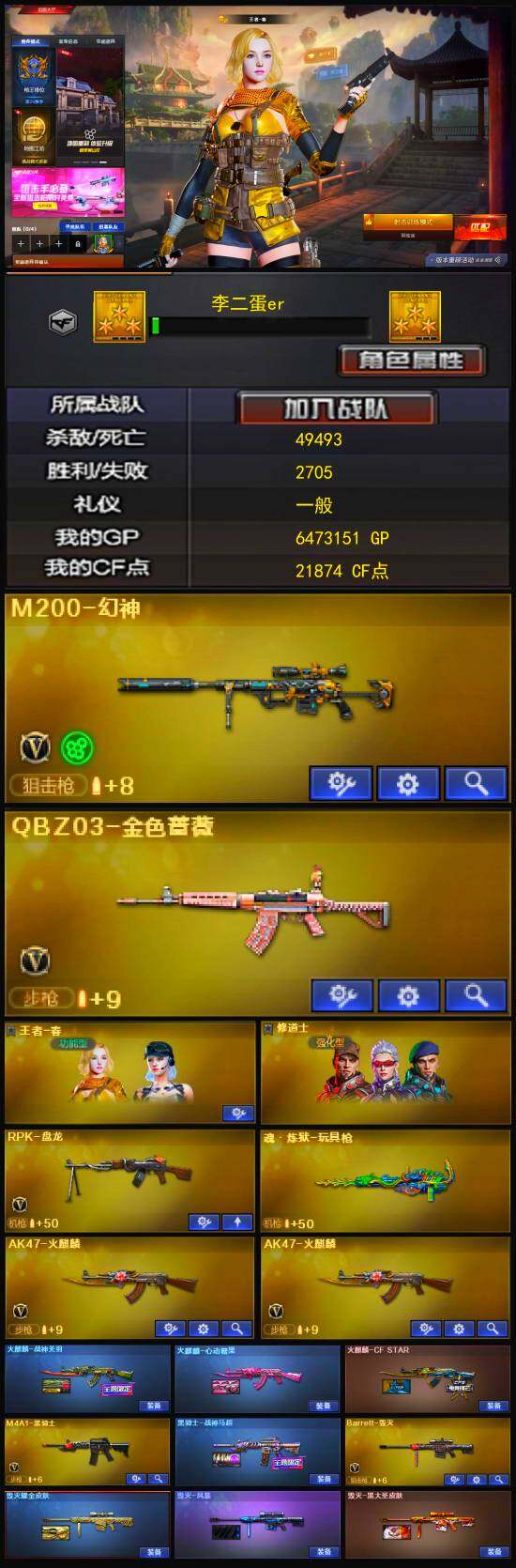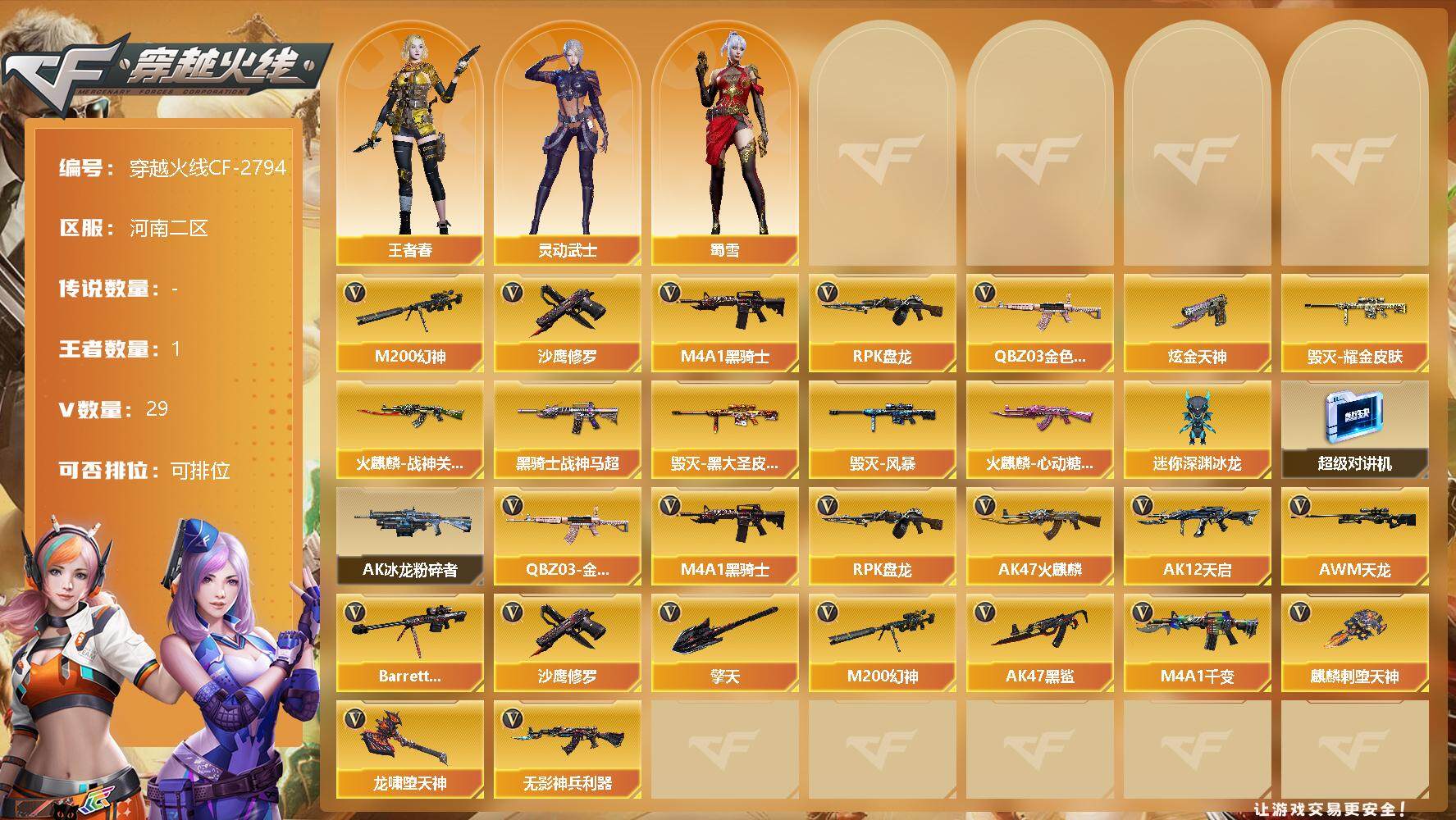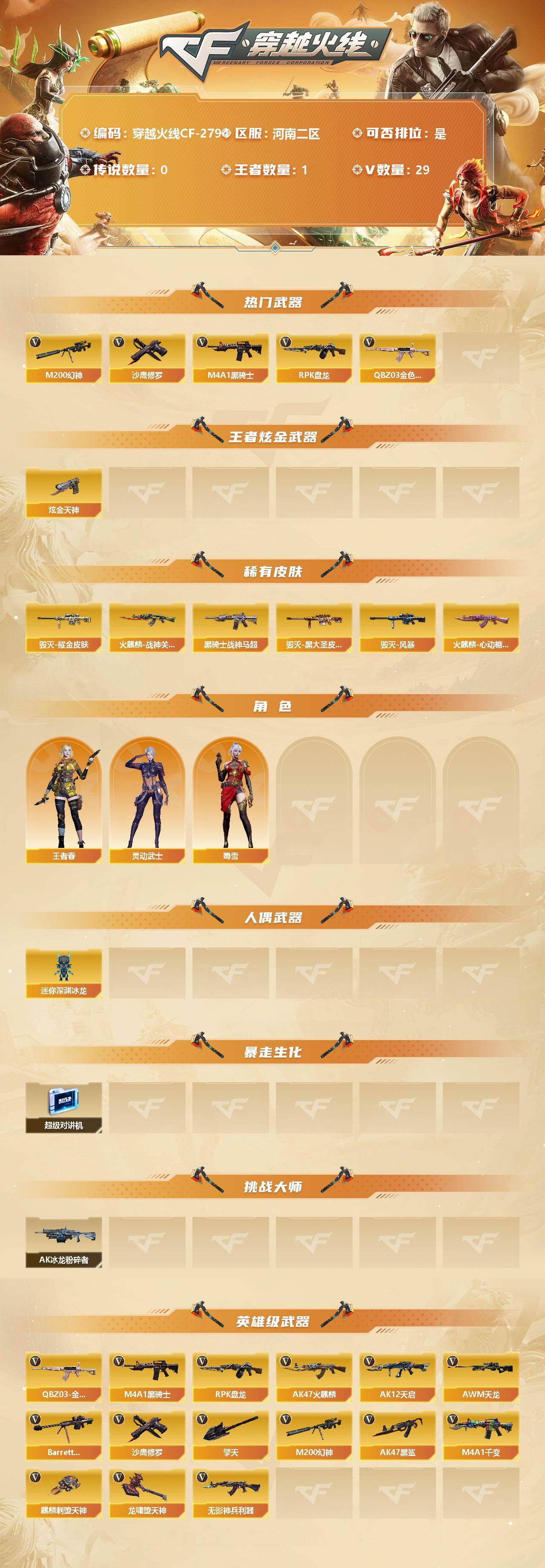 [12945746]河南二区-29V-1王者-2炫金 【热门武器】:QBZ03-金色蔷薇,M200-幻神,M4A1-黑骑士,RPK-盘龙,沙鹰-修罗*3 【王者炫金武器】:炫金天神*2 【稀有皮肤】:火麒麟-战神关羽,火麒麟-心动糖果,黑骑士-战神马超,毁灭耀金皮肤,毁灭-黑大圣皮肤,毁灭-风暴 【角色】:王者春,蜀雪,灵动武士 【人偶武器】:迷你深渊冰龙 【暴走生化】:超级对讲机 【挑战大师】:AK47-冰龙粉碎者 【英雄级武器】:麒麟刺-堕天神*2,龙啸-堕天神,QBZ03-金色蔷薇,无影-神兵利器,M4A1-黑骑士,RPK-盘龙,AK47-火麒麟*2,AK12-天启,AWM-天龙*5,Barrett-毁灭,M200-幻神,AK47-黑鲨,M4A1-千变,沙鹰-修罗*3,擎天 【特殊枪械】:1黑骑士,1盘龙