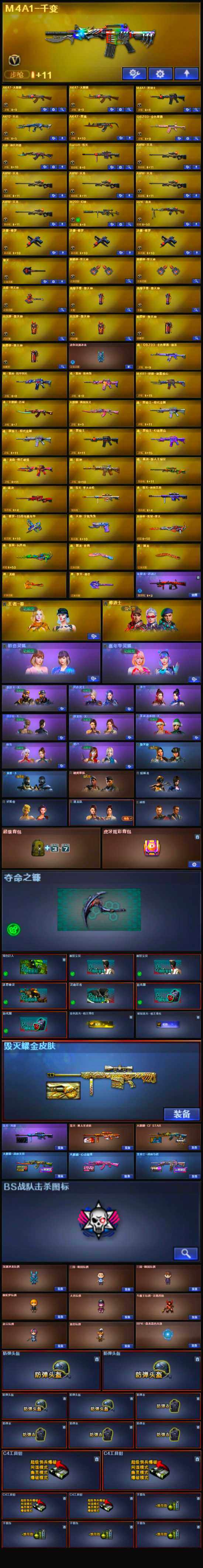 【英雄级武器】:麒麟刺-堕天神*2,龙啸-堕天神,QBZ03-金色蔷薇,无影-神兵利器,M4A1-黑骑士,RPK-盘龙,AK47-火麒麟*2,AK12-天启,AWM-天龙*5,Barrett-毁灭,M200-幻神,AK47-黑鲨,M4A1-千变,沙鹰-修罗*3,擎天