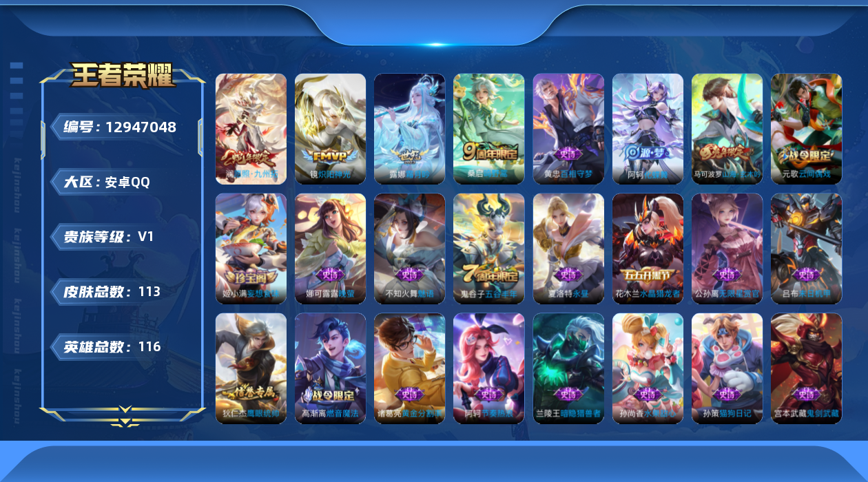 - [11824098]V7 1典藏 10传说 123英雄 216皮肤 可修改实名 优质装备:神鉴启示录,黄金射手座,云鹰飞将(小将军),久胜战神,一念神魔,零号·赤焰,时之恋人-刘备(电焊工),无双飞将 珍宝阁皮:胡桃夹子,女武神 限定皮:愿照·九州拓(澜年限),愿照·岁时盈(虞姬年限),愿照·众生和(妲己年限),神威(电光马子),高山流水,五谷丰年,梁祝,烈魂,逐梦之音,李小龙,逐梦之影,孙行者,山海·玄木吟(马可年限) 史诗皮:鸭鸭历险记-刘禅,化蝶舞,龙之律动,雪豹·霜爪,石田雨龙,茶境仙,百相守梦-百里守约,百相守梦-黄忠,紫霞仙子,白龙吟,黄金分割率,特工魅影,千年之狐,电玩·爆裂旋风,蒙恬荣光圣徽,偶像歌手,龙骑士(小龙虾),暗夜猫娘,晚萤,青蛇,末日机甲-吕布,猫狗日记-孙策,时之恋人-孙尚香,节奏热浪,修罗,女仆咖啡,水果甜心,星夜王子,心灵骇客,时之奇旅-安琪拉,德古拉伯爵,暗隐猎兽者,鬼剑武藏,心灵战警,乐园奇幻夜,地狱岩魂,缤纷独角兽,曙光守护者,热力回旋,金属风暴,圣诞狂欢,圣诞恋歌,鹰眼统帅,魅力维加斯,黎明之约,无心