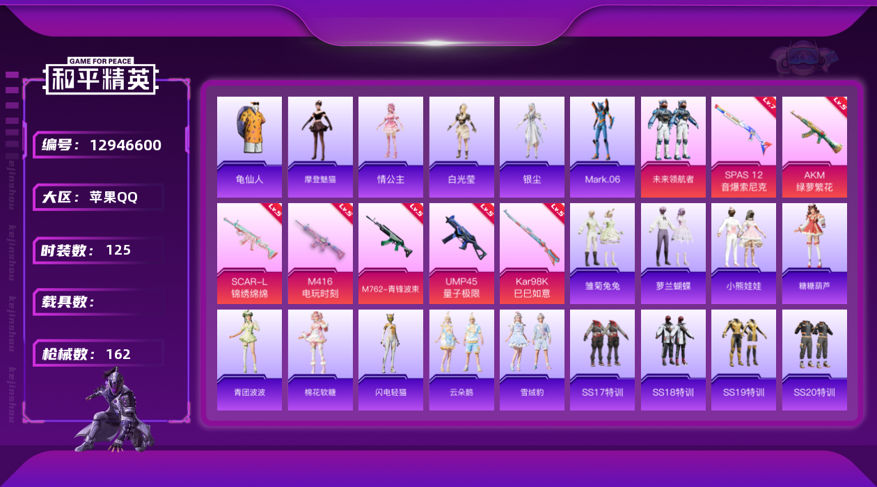 - [12653765]素材身法号/沙丘之主-图卡盟(四级)/绝世印记1 苹果 手Q-1神装-6粉装-6特效枪-2载具-2粉色飞行器-5.5w热力值-9王牌印记-109套装-157枪皮【红色神装等级】:沙丘之主-图卡盟(四级)【热门品类】:粉装-梦幻火箭,套装-忍者信条,套装-龟仙人,角色-8号机,角色-Mark.06【粉色载具】:迈凯伦塞纳(冷萃蓝),星梦玉骢【粉色套装】:粉装-梦幻火箭,粉装-星之彼岸,粉装-蜜语绒猫,角色-星梦奇缘,粉装-金丰海韵【粉色枪皮等级】:AKM-绿萝繁花(五级),SCAR-L-锦绣绵绵(五级),M416-电玩时刻(五级),P90-沙丘之主(三级),Kar98K-巳巳如意(五级),PKM-江南烟雨(四级)【粉色飞行器】:沙丘之主天马,龙翔九天飞行器