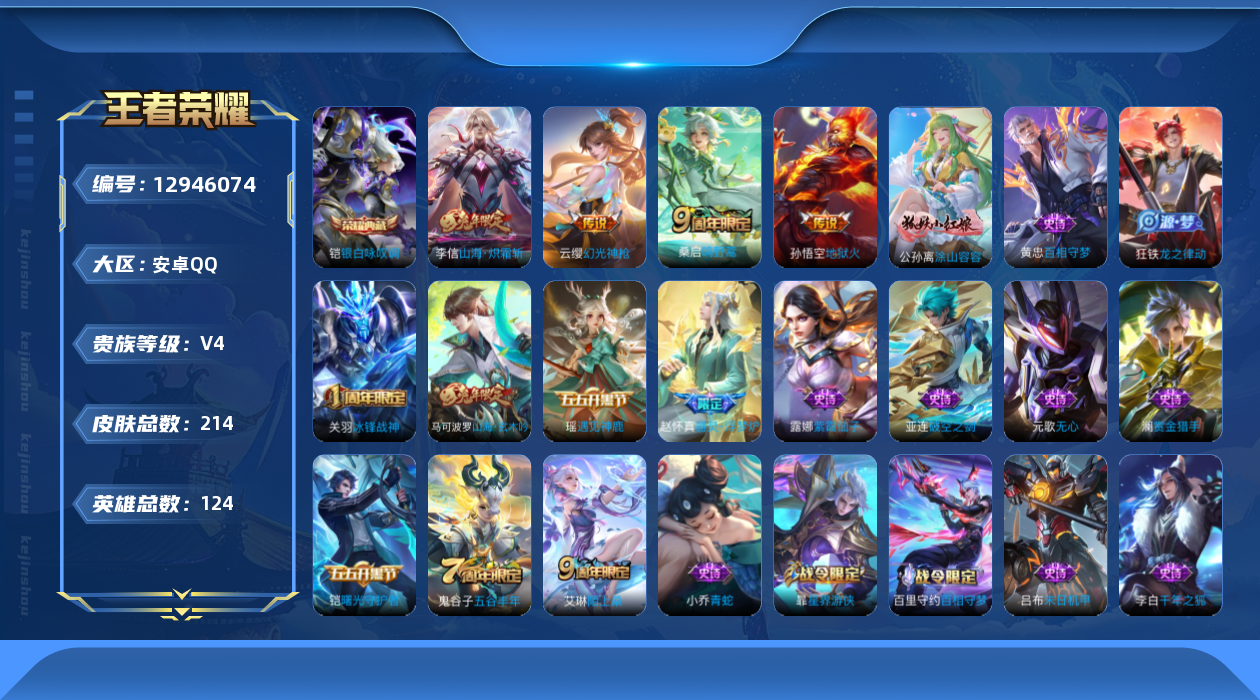 [12946074]【特价急出/详情看图】:安卓Q-V4-永恒钻石II段位-124英雄-214皮肤-1典藏-4传说-47史诗