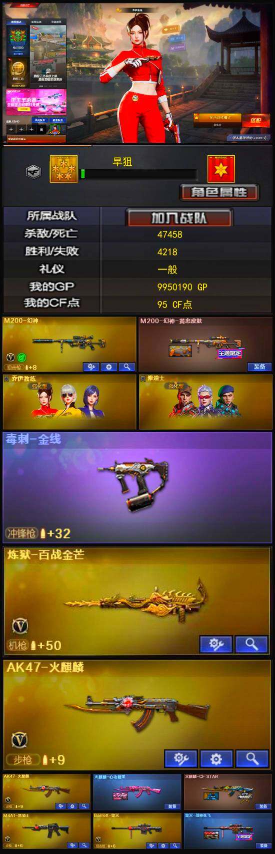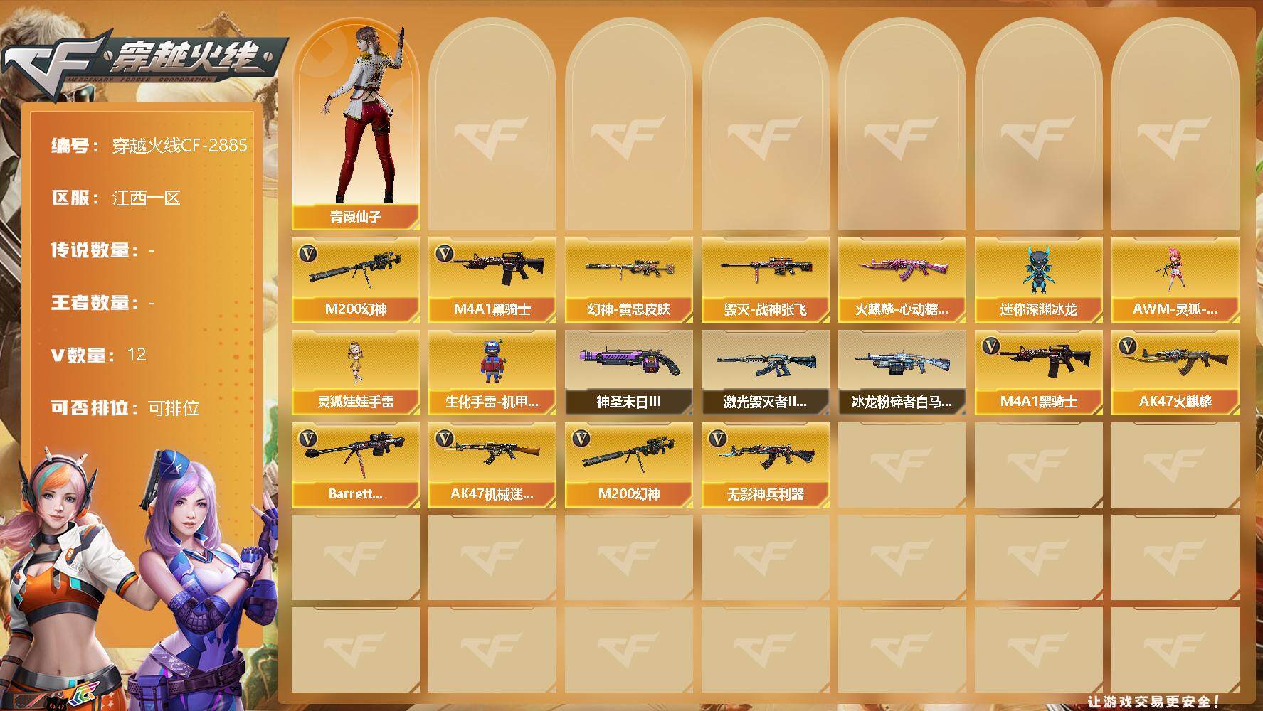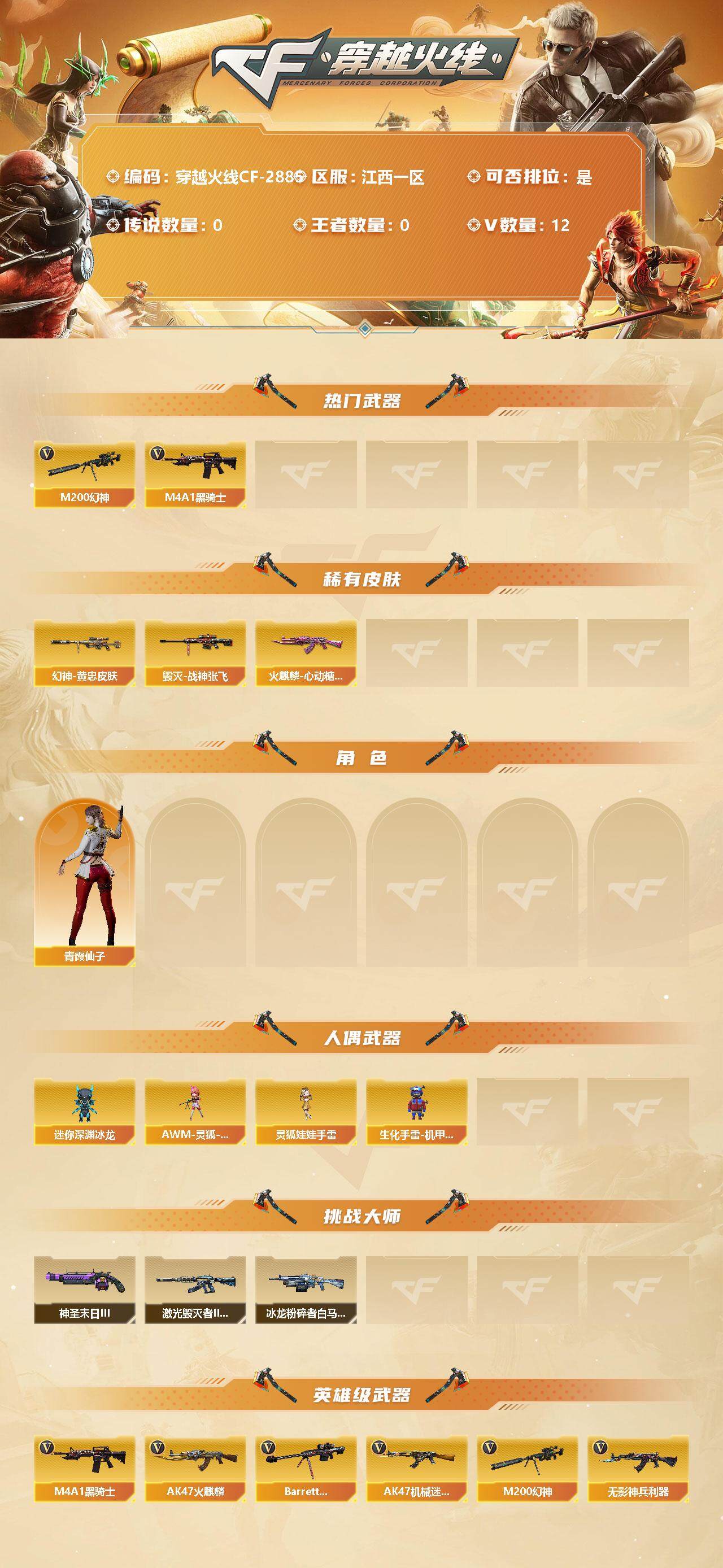 [12946377]江西一区-12V-0王者-0炫金 【热门武器】:M200-幻神,M4A1-黑骑士 【稀有皮肤】:M200-幻神-黄忠皮肤,火麒麟-心动糖果,毁灭-战神张飞 【角色】:青霞仙子 【人偶武器】:AWM-灵狐-15周年嘉年华,迷你深渊冰龙,灵狐娃娃手雷,生化手雷-机甲核心 【挑战大师】:神圣爆裂者-末日III,激光毁灭者III-白马银枪,冰龙粉碎者-白马银枪 【英雄级武器】:无影-神兵利器,M4A1-黑骑士,AK47-火麒麟*2,Barrett-毁灭,AK47-机械迷城,M200-幻神 【特殊枪械】:1黑骑士