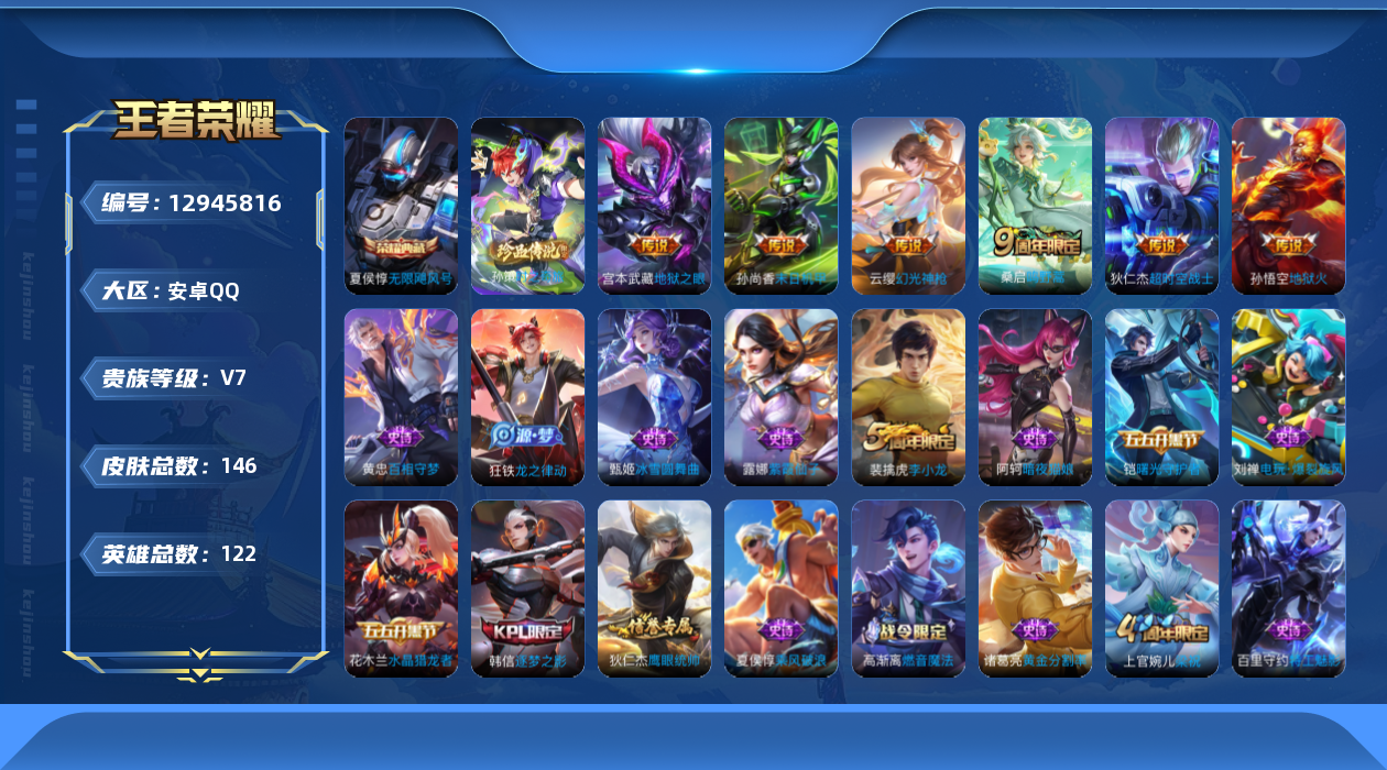 [12945816]暑期末清货/特价急出/永久包赔:安卓Q-V7-最强王者段位-122英雄-146皮肤-1典藏-1珍品传说-6传说-31史诗