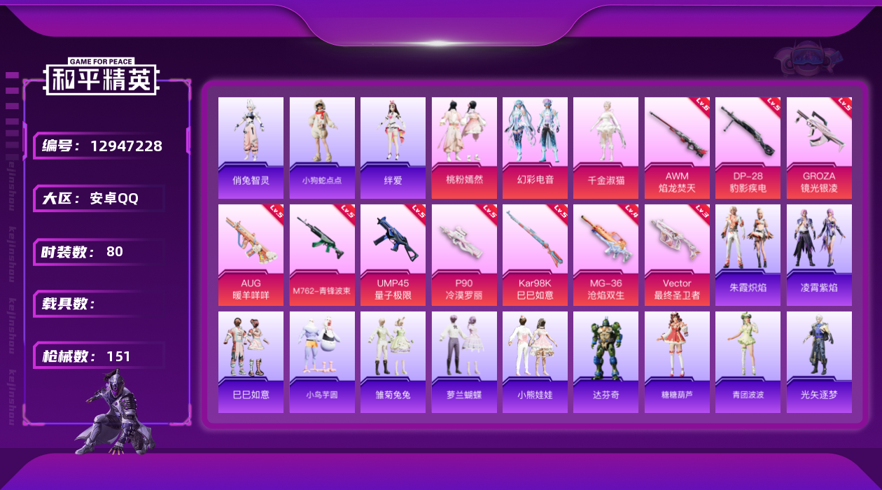 - PX_2066511- 苹果手Q-16王牌印记-10粉装-7特效枪-0载具-96729热力值-216套装-306枪皮-0卓越印记-0传奇印记 【10粉装】,梦幻火箭,彩虹甜喵,光极星,千金淑猫,飒粉甜心,蓝莓炮弹,智能音符,天禅智恒,音爆索尼克,金丰海韵 【7特效枪】AKM-星际浪客-6级 SCAR-L-纯梦嫁纱-7级 M416-五爪金龙-6级 GROZA-旋转彩虹-6级 Kar98K-巳巳如意-