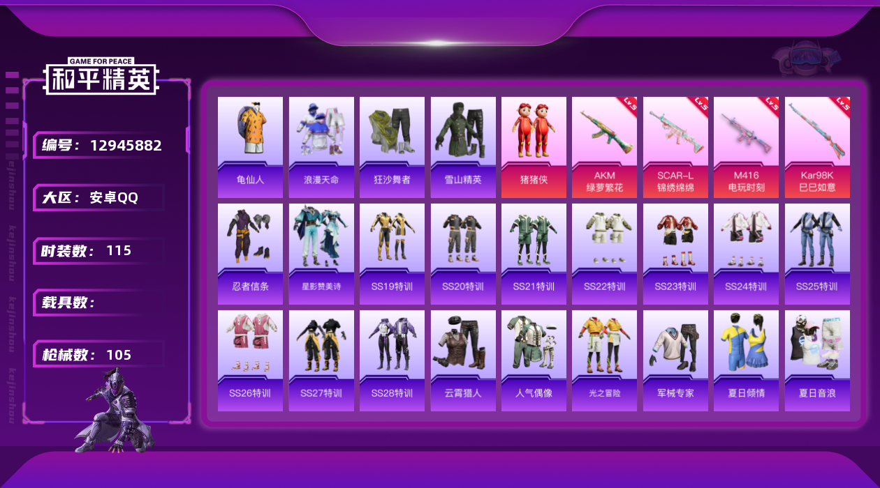 [12945882]【暑期末清货/特价急出/永久包赔】:安卓 手Q-1粉装-4特效枪-2.9w热力值-5印记-115套装-105枪皮【热门品类】:套装-忍者信条,套装-AG战队服【特效枪等级】:AKM-绿萝繁花(五级),SCAR-L-锦绣绵绵(五级),M416-电玩时刻(五级),Kar98K-巳巳如意(五级)【优质套装】:玩偶服-猪猪侠