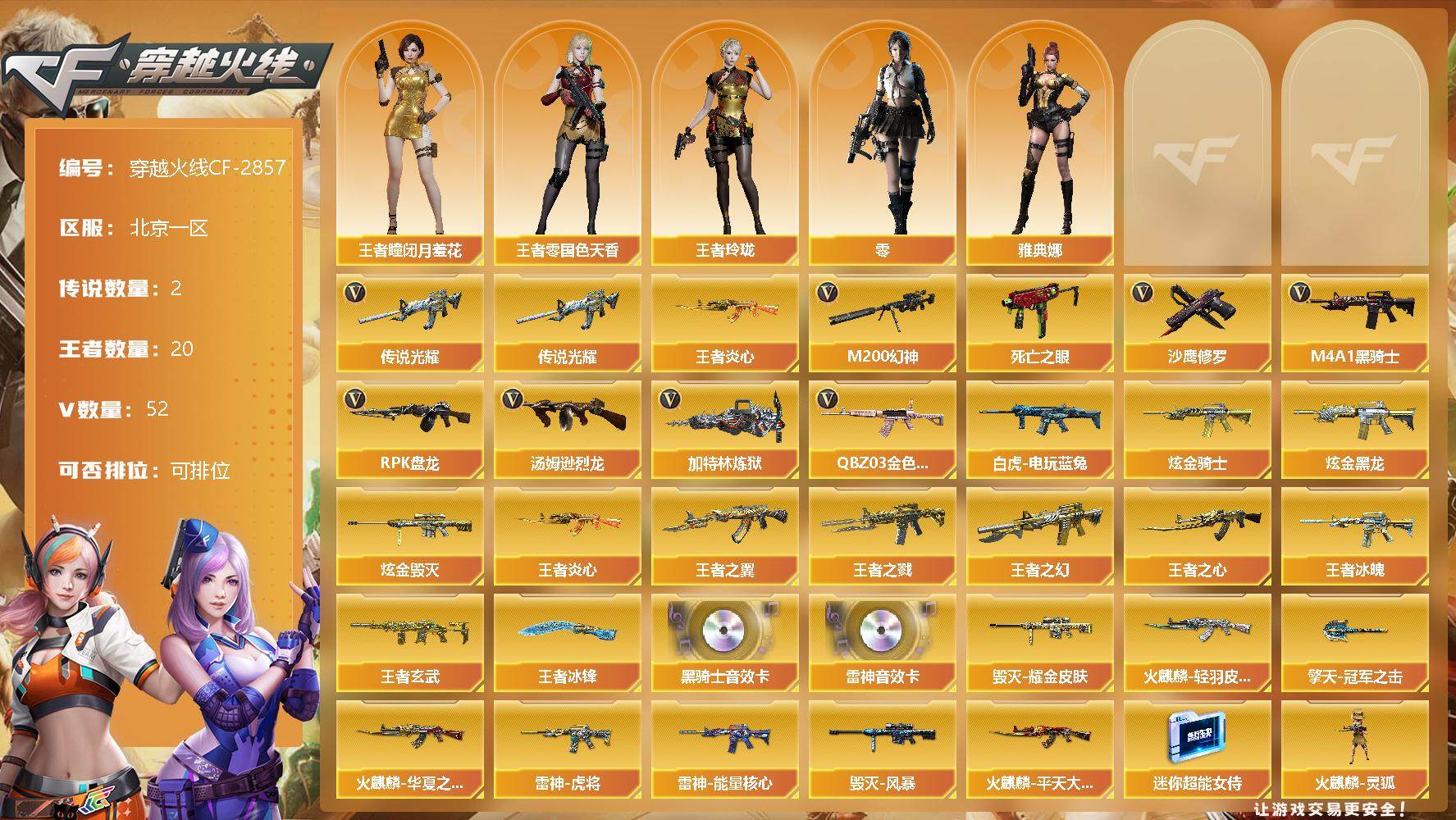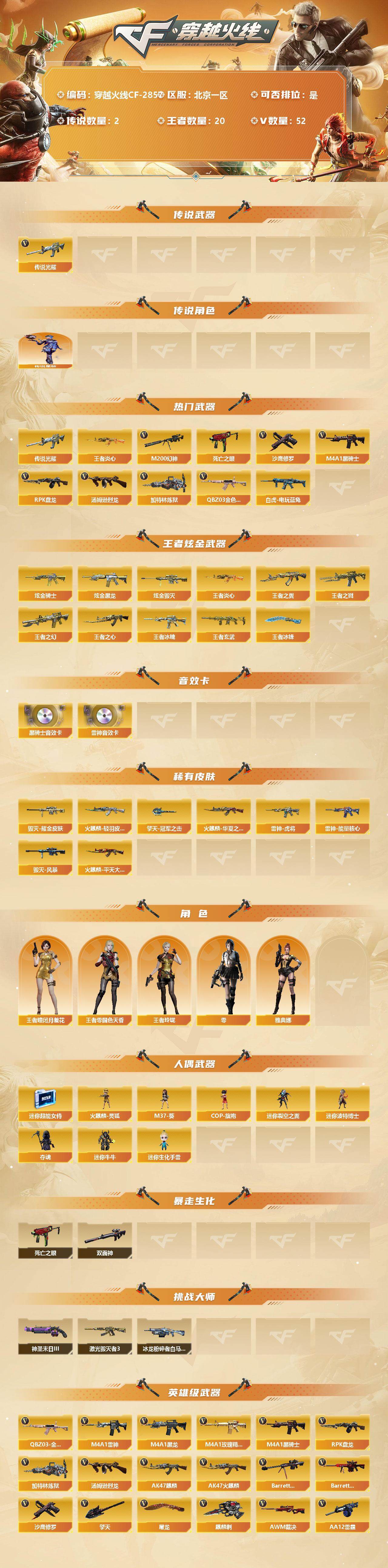 [12946184]北京一区-52V-20王者-4炫金 【传说武器】:传说光耀 【传说角色】:传说星骇 【热门武器】:传说光耀,QBZ03-金色蔷薇,M200-幻神,死亡之眼*3,白虎-电玩蓝兔,王者炎心,M4A1-黑骑士,汤姆逊-烈龙*3,RPK-盘龙,加特林-炼狱*4,沙鹰-修罗*3 【王者炫金武器】:炫金骑士,炫金黑龙,炫金毁灭*2,王者冰魄,王者炎心,王者之戮,王者之幻,王者之翼,王者之心,王者玄武,王者冰锋 【音效卡】:M4A1-雷神音效卡,M4A1-黑骑士音效卡 【稀有皮肤】:雷神-能量核心,雷神-虎将,火麒麟-华夏之心,火麒麟-轻羽皮肤,火麒麟-平天大圣,毁灭耀金皮肤,毁灭-风暴,擎天-冠军之击 【角色】:王者-瞳-闭月羞花,王者-零-国色天香,王者玲珑,雅典娜,零 【人偶武器】:火麒麟-灵狐,M37-葵,COP-旗袍,迷你超能女侍,迷你裂空之翼,迷你波特博士*3,夺魂,迷你牛牛,迷你生化手雷*2 【暴走生化】:死亡之眼*3,双面神 【挑战大师】:神圣爆裂者-末日III,激光毁灭者III,冰龙粉碎者-白马银枪 【英雄级武器】:QBZ03-金色蔷薇,白虎-电玩蓝兔,无影-神兵利器,M4A1-雷神*2,M4A1-黑龙,M4A1-玫瑰精灵,M4A1-黑骑士,RPK-盘龙,加特林-炼狱*4,汤姆逊-烈龙*3,AK47-麒麟,AK47-火麒麟,Barrett-毁灭*2,Barrett-极光,AWM-裁决*2,AA-12-雷霆,M200-幻神,M4A1-千变,AK-47-猩红传说*2,M4A1-赤狱骑士,沙鹰-修罗*3,麒麟刺*2,擎天,屠龙*2 【特殊枪械】:1黑骑士,3烈龙,1盘龙,4炼狱