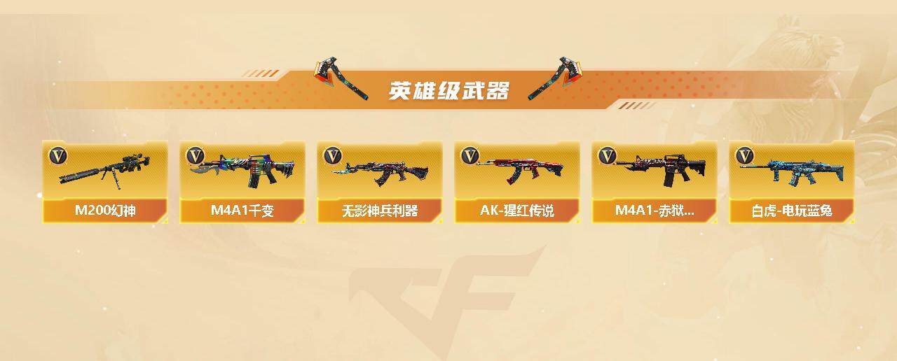 【英雄级武器】:QBZ03-金色蔷薇,白虎-电玩蓝兔,无影-神兵利器,M4A1-雷神*2,M4A1-黑龙,M4A1-玫瑰精灵,M4A1-黑骑士,RPK-盘龙,加特林-炼狱*4,汤姆逊-烈龙*3,AK47-麒麟,AK47-火麒麟,Barrett-毁灭*2,Barrett-极光,AWM-裁决*2,AA-12-雷霆,M200-幻神,M4A1-千变,AK-47-猩红传说*2,M4A1-赤狱骑士,沙鹰-修罗*3,麒麟刺*2,擎天,屠龙*2