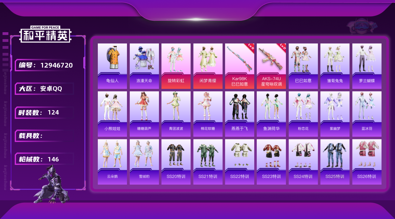 - [7717499]实名: 可修改 时装数: 282 枪械数: 107 战备数: 80 热门装扮: 潮萌小黄鸭,炫光之旅,女娲灵识 稀有枪皮: MG3洛神天依,SCAR-L-锦绣绵绵,Kar98K-巳巳如意,AUG-暖羊咩咩,MK14-樱桃泡泡
