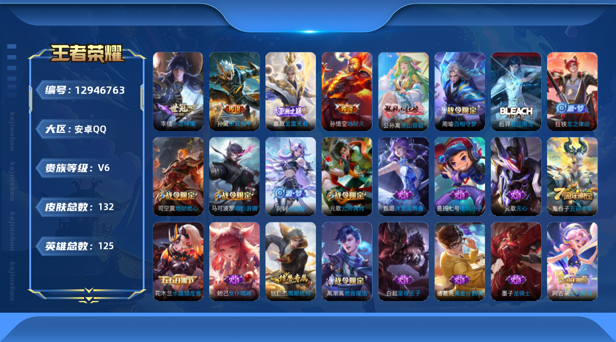 [12946763]安卓Q-V6-永恒钻石IV段位-125英雄-132皮肤-4传说-36史诗 【英雄全皮】:空空儿全皮 【传说皮肤】:嬴政玄雷天君,孙策末日机甲,李信一念神魔,孙悟空地狱火 【限定皮肤】:杨戬破阵退雄兵,狄仁杰阴阳师,赵云皇家上将,庄周高山流水,芈月幻夜卜梦,元歌云间偶戏,元歌无心,马可波罗暗影游猎,狄仁杰魔术师,狄仁杰万华元夜,达摩沙漠行僧,项羽海滩派对,兰陵王金庭之子,李元芳云中旅人,钟馗驱傩正仪,干将莫邪胡桃夹子,鬼谷子五谷丰年,苏烈千军破阵,沈梦溪大漠名商,裴擒虎擒涛扼浪,西施玲珑珍味,鲁班大师探海日志,桑启海盐诗旅,艾琳流音漫舞,司空震地狱燃心,阿古朵江河有灵,张良古海寻踪,高渐离燃音魔法,妲己灵卜魔法,鬼谷子天穹祈灯,沈梦溪龙舞盛年,鲁班七号蔬乡物语,李元芳蔬乡物语,刘邦剑破天穹,程咬金群星魔术团,项羽苍威无极,刘备异域游侠 【赛季限定】:狄仁杰万华元夜,达摩沙漠行僧,兰陵王金庭之子,张良古海寻踪,李元芳云中旅人,钟馗驱傩正仪,苏烈千军破阵,沈梦溪大漠名商,裴擒虎擒涛扼浪,鲁班大师探海日志,桑启海盐诗旅,鬼谷子天穹祈灯,刘邦剑破天穹 【战令限定】:芈月幻夜卜梦,元歌云间偶戏,马可波罗暗影游猎,艾琳流音漫舞,西施玲珑珍味,司空震地狱燃心,高渐离燃音魔法,妲己灵卜魔法,鲁班七号蔬乡物语,李元芳蔬乡物语,项羽苍威无极 【史诗皮肤】:鲁班七号电玩小子,赵云皇家上将,貂蝉圣诞恋歌,甄姬冰雪圆舞曲,狄仁杰魔术师,宫本武藏鬼剑武藏,孙尚香水果甜心,嬴政暗夜贵公子,嬴政摇滚巨星,妲己魅力维加斯,妲己女仆咖啡,墨子龙骑士,墨子金属风暴,刘禅绅士熊喵,花木兰水晶猎龙者,兰陵王暗隐猎兽者,诸葛亮黄金分割率,雅典娜冰冠公主,白起星夜王子,阿轲节奏热浪,狄仁杰鹰眼统帅,马可波罗暗影游猎,元歌云间偶戏,庄周高山流水,鬼谷子五谷丰年,元歌无心,司空震地狱燃心,阿古朵江河有灵,妲己灵卜魔法,高渐离燃音魔法,鲁班七号蔬乡物语,孙膑茶境仙,阿轲化蝶舞,狂铁龙之律动,后羿石田雨龙,周瑜百相守梦,公孙离涂山容容 【其他皮肤】:项羽海滩派对,韩信教廷特使,露娜哥特玫瑰,赵云白执事,赵云忍炎影,程咬金星际陆战队,白起白色死神,牛魔西部大镖客,宫本武藏未来纪元,安琪拉玩偶对对碰,妲己少女阿狸,亚瑟死亡骑士,达摩拳王,张飞五福同心,狄仁杰阴阳师,刘备汉昭烈帝,宫本武藏霸王丸,王昭君幻想奇妙夜,诸葛亮掌控