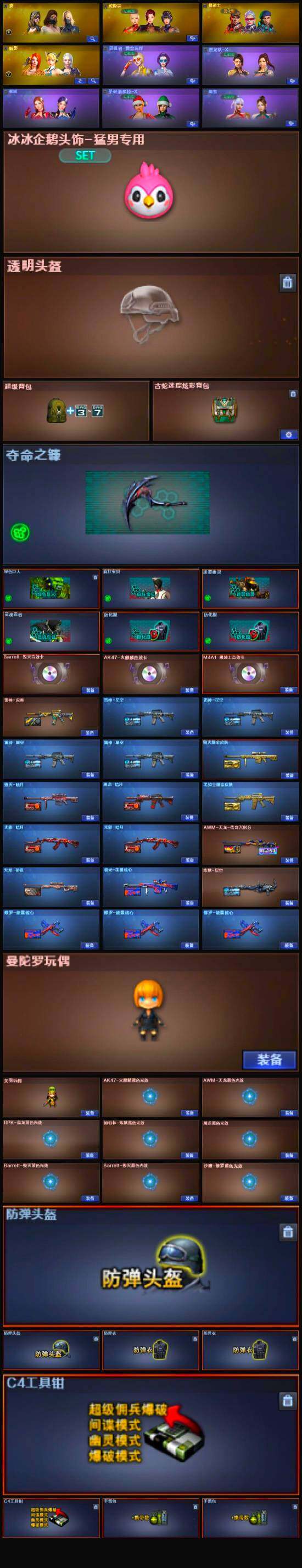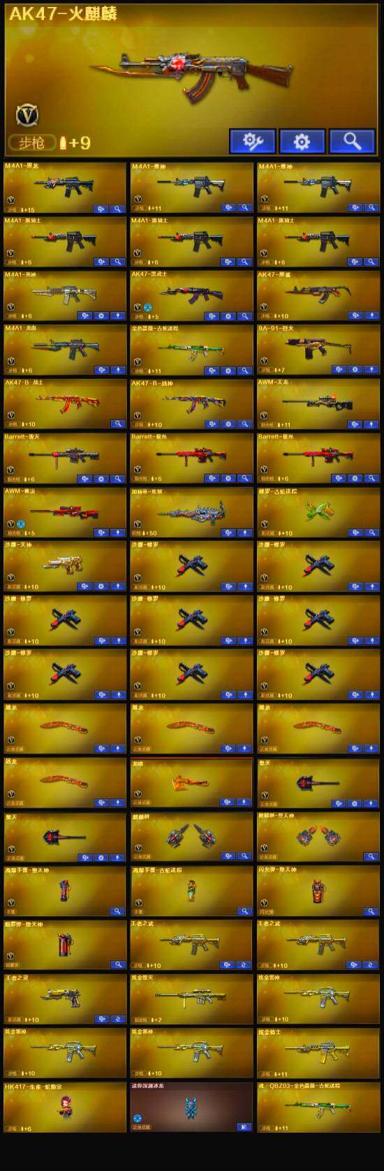 【英雄级武器】:AK47-火麒麟,M4A1-黑龙,M4A1-雷神*2,M4A1-黑骑士*3,M4A1-死神,AK47-黑武士,AK47-黑鲨,M4A1-龙血,金色蔷薇-古蛇迷踪,AK-47-猩红传说*8,AK47-B-战神,AWM-天龙,Barrett-毁灭,Barrett-极光*2,AWM-裁决,加特林-炼狱,沙鹰-修罗*8,沙鹰-天神,修罗-古蛇迷踪,屠龙*4,龙啸,麒麟刺-堕天神,擎天*2,麒麟刺,M4A1-赤狱骑士
