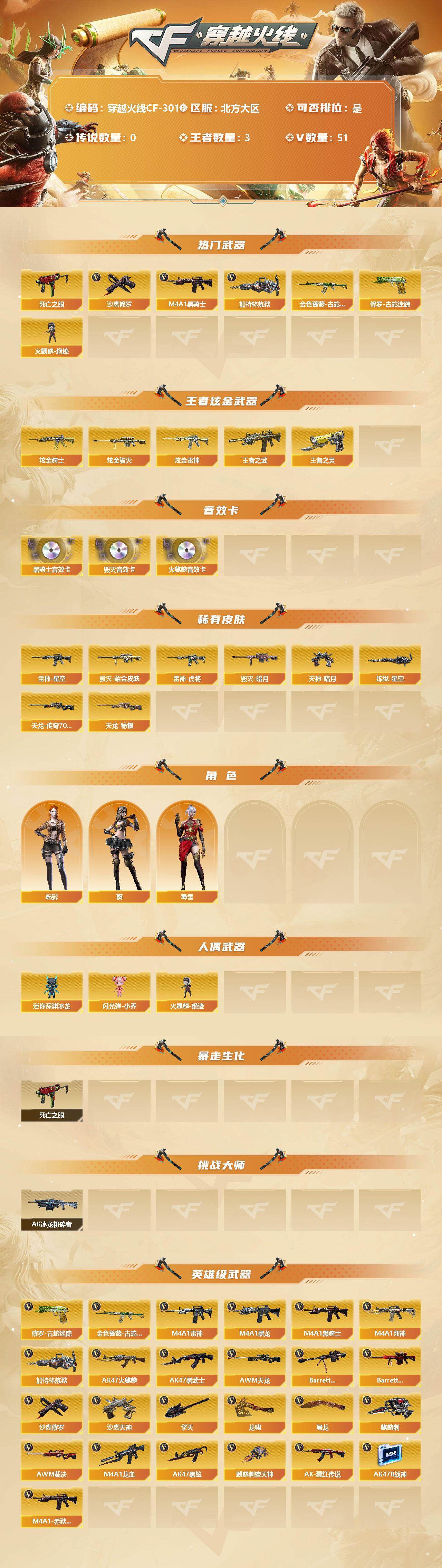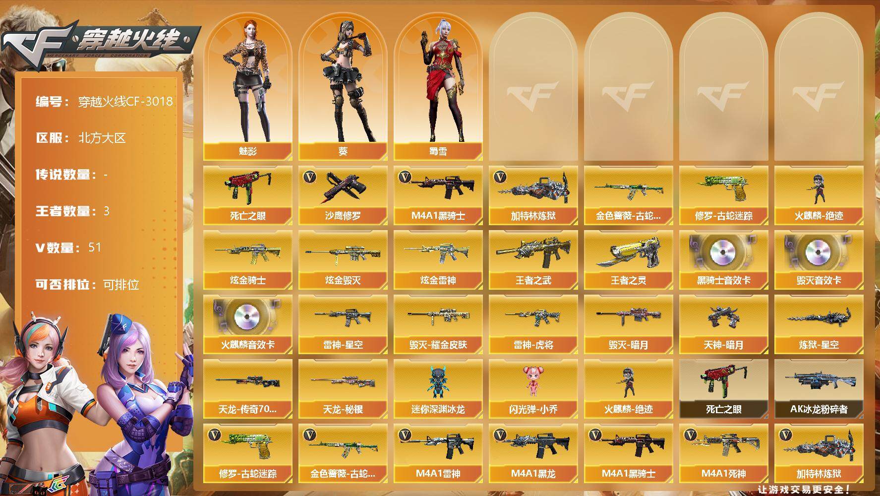 [12947488]北方大区-51V-3王者-5炫金 【热门武器】:金色蔷薇-古蛇迷踪,修罗-古蛇迷踪,死亡之眼,M4A1-黑骑士*3,加特林-炼狱,火麒麟-绝迹,沙鹰-修罗*8 【王者炫金武器】:王者之武*2,王者之灵,炫金骑士,炫金毁灭,炫金雷神*3 【音效卡】:AK47-火麒麟音效卡,M4A1-黑骑士音效卡,Barrett-毁灭音效卡 【稀有皮肤】:雷神-星空*4,雷神-虎将,炼狱-星空,毁灭-暗月,毁灭耀金皮肤,天龙-秘银,AWM-天龙-传奇70KG,天神-暗月*2 【角色】:葵,魅影,蜀雪 【人偶武器】:火麒麟-绝迹,迷你深渊冰龙,闪光弹-小乔 【暴走生化】:死亡之眼 【挑战大师】:AK47-冰龙粉碎者 【英雄级武器】:AK47-火麒麟,M4A1-黑龙,M4A1-雷神*2,M4A1-黑骑士*3,M4A1-死神,AK47-黑武士,AK47-黑鲨,M4A1-龙血,金色蔷薇-古蛇迷踪,AK-47-猩红传说*8,AK47-B-战神,AWM-天龙,Barrett-毁灭,Barrett-极光*2,AWM-裁决,加特林-炼狱,沙鹰-修罗*8,沙鹰-天神,修罗-古蛇迷踪,屠龙*4,龙啸,麒麟刺-堕天神,擎天*2,麒麟刺,M4A1-赤狱骑士 【特殊枪械】:3黑骑士,1炼狱