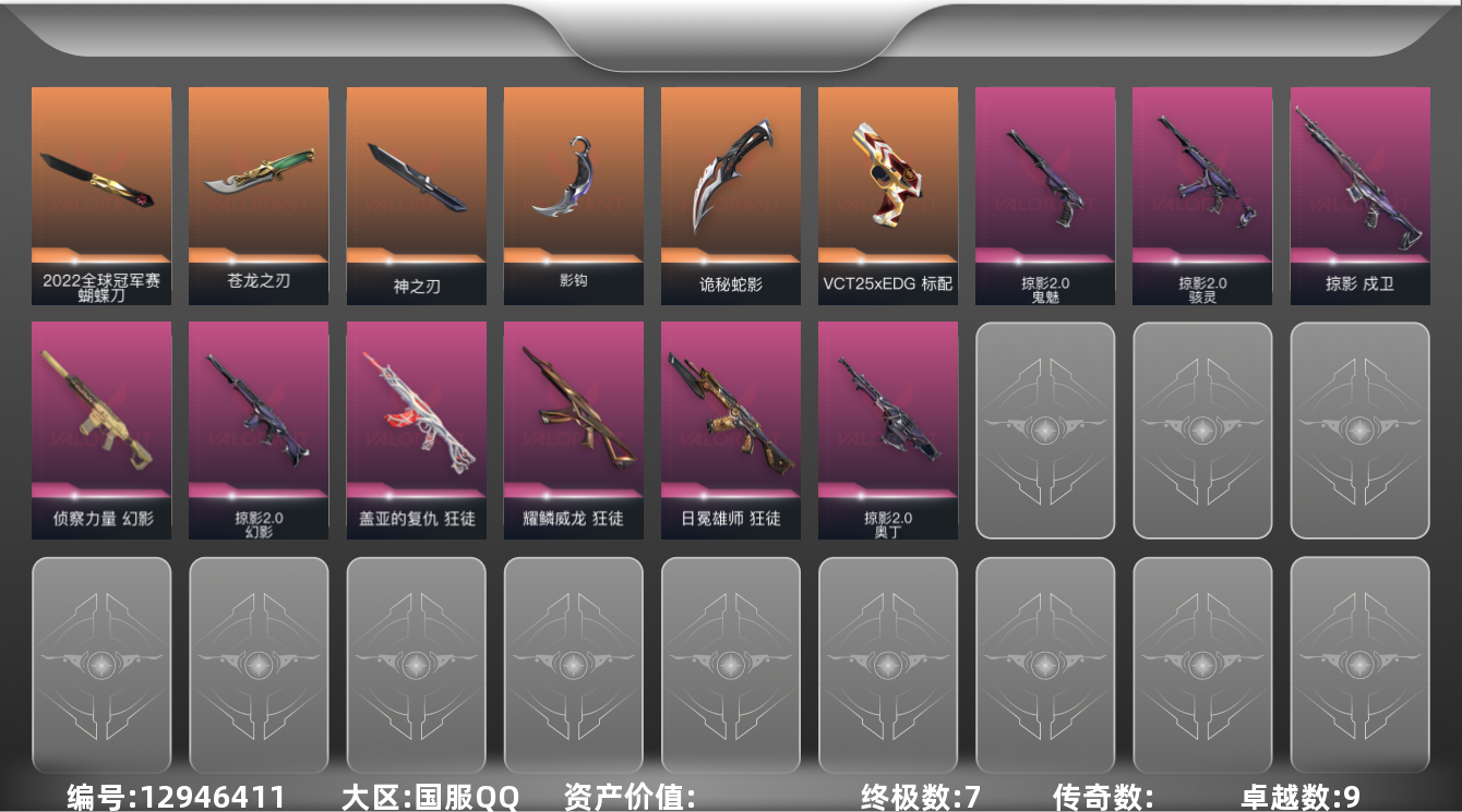 [12946411]皮肤资产价值26520/已用R点480【套装】:掠影//2.0套装 【英雄】:幻棱,炼狱,维斯,暮蝶,壹决,铁臂,捷风,雷兹,幽影,不死鸟,贤者,猎枭,零,芮娜,奇乐,尚勃勒,霓虹,斯凯,夜露,K/O,盖可,黑梦,钢锁 【近战 武器】:近战武器-2022全球冠军赛 蝴蝶刀,近战武器-神之刃,近战武器-5周年//公测重制版 苍龙之刃,近战武器-影钩,近战武器-诡秘蛇影 军刀 【狂徒】:狂徒-盖亚的复仇,狂徒-日冕雄师,狂徒-耀鳞威龙,狂徒-诡秘蛇影 【幻影】:幻影-侦察力量,幻影-掠影//2.0,幻影-末日之翼 【戍卫】:戍卫-掠影,戍卫-折光棱晶 【飞将】:飞将-末日之翼 【莽侠】:莽侠-诡秘蛇影 【奥丁】:奥丁-掠影//2.0,奥丁-末日之翼 【判官】:判官-诡秘蛇影 【骇灵】:骇灵-掠影//2.0 【蜂刺】:蜂刺-折光棱晶 【标配】:标配-折光棱晶 【VCT手枪】:标配-VCT25 x EDG 【鬼魅】:鬼魅-掠影//2.0,鬼魅-诡秘蛇影 【短炮】:短炮-末日之翼 【卡面】:南瓜盛典 卡面,树懒大作战 卡面,Clutch 卡面,无畏契约GO!第一卷:芮娜 卡面,无畏契约GO!第一卷:零 卡面,《双城之战》金克丝 卡面,战术小伙伴 卡面,钢锁vs盖可 卡面,代号红色 卡面,新兵报到 卡面,V契约 卡面,无畏契约 卡面 【喷漆】:霓光四射 喷漆,买装还是存钱 喷漆,关门放狗 喷漆,放下武器 喷漆,胜利属于无畏契约 喷漆,GLHF 喷漆,无畏契约 喷漆 【挂饰】:无畏契约GO!第一卷 芮娜 挂饰,无畏契约GO!第一卷 零 挂饰,VCT x EDG 挂饰,天外飞客 挂饰,无畏契约 纪念币 挂饰