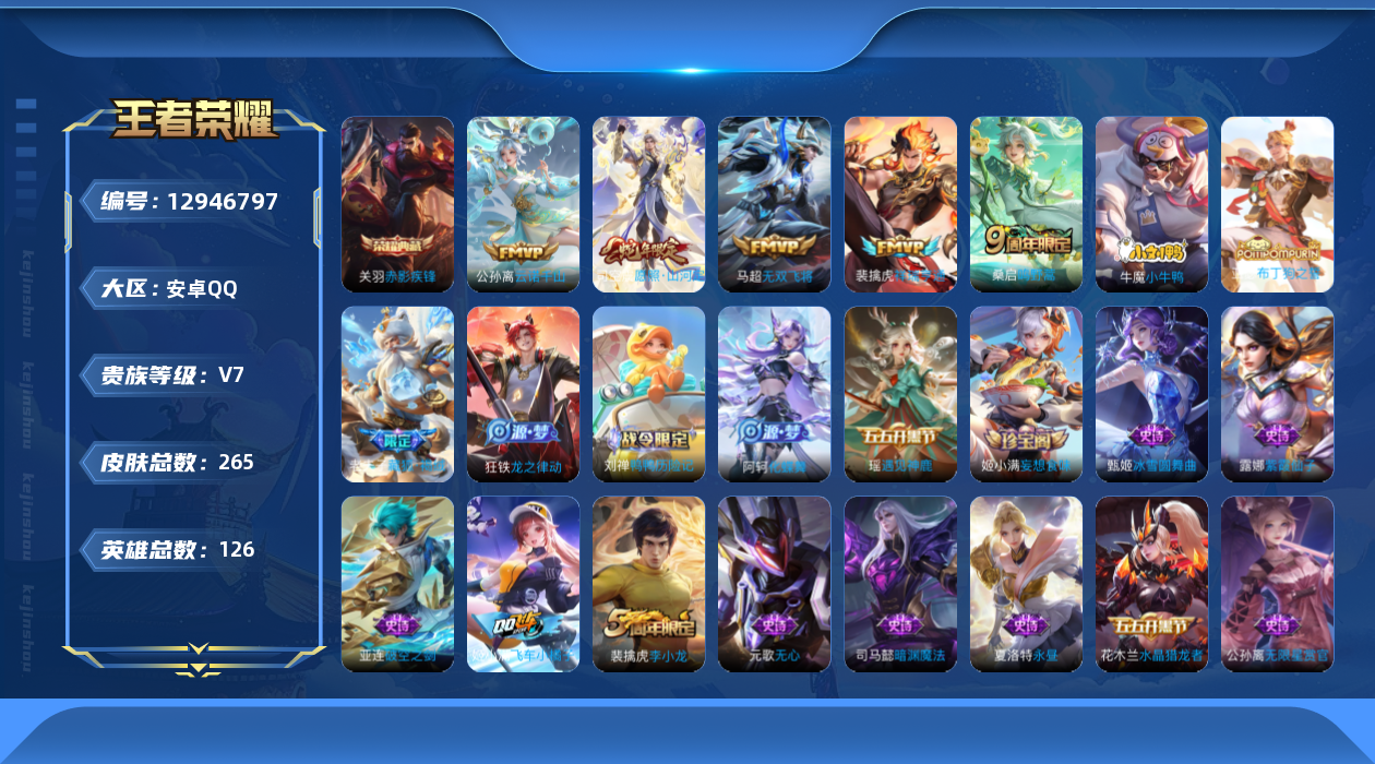 [12946797]安卓Q-V7-最强王者段位-126英雄-265皮肤-1典藏-0珍品无双-0无双-0珍品传说-5传说-72史诗