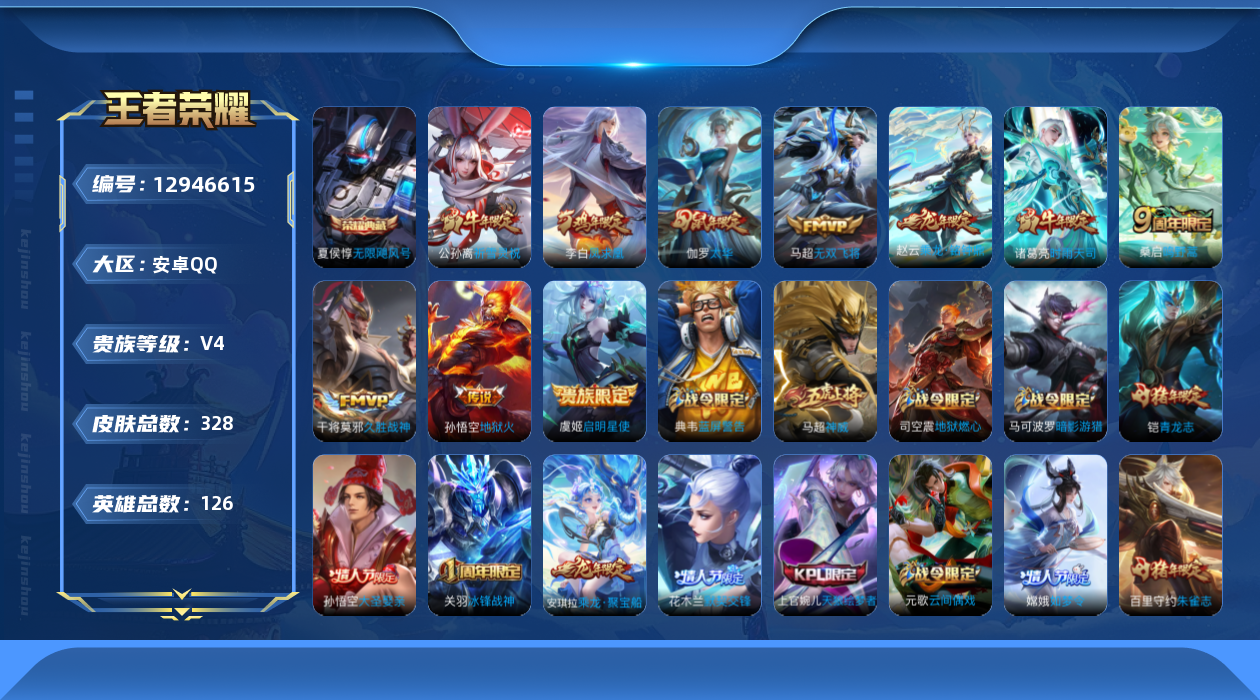[12946615]【特价急出/详情看图】:安卓Q-V4-永恒钻石III段位-126英雄-328皮肤-1典藏-10传说-100史诗