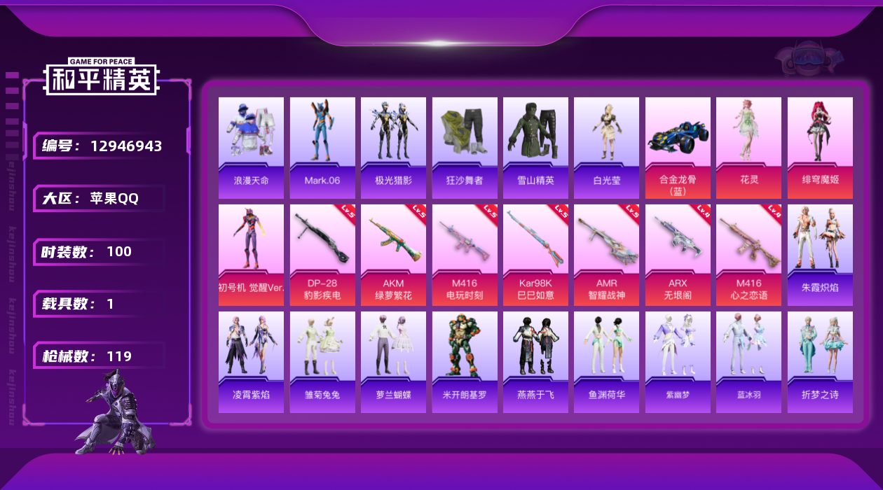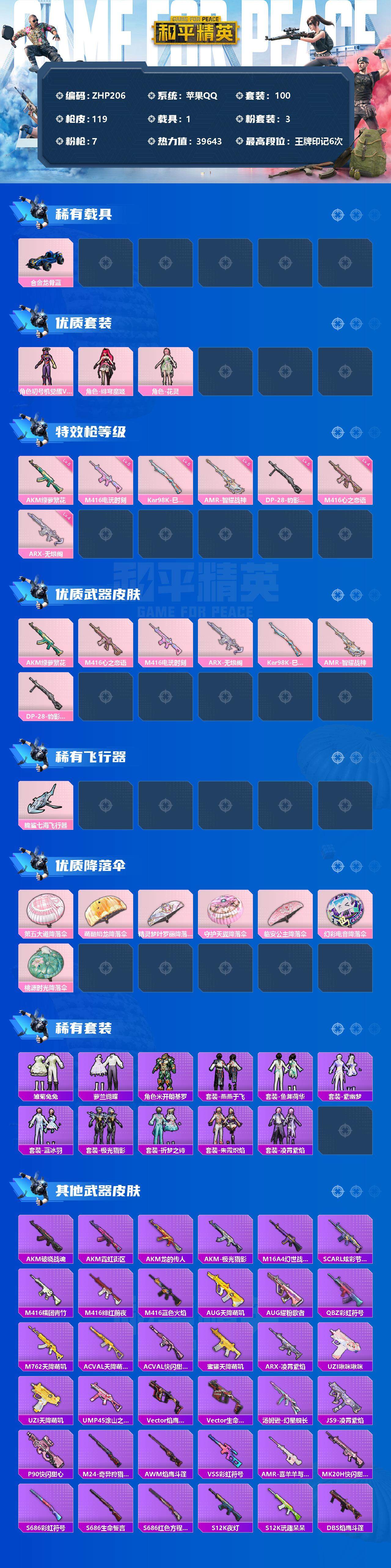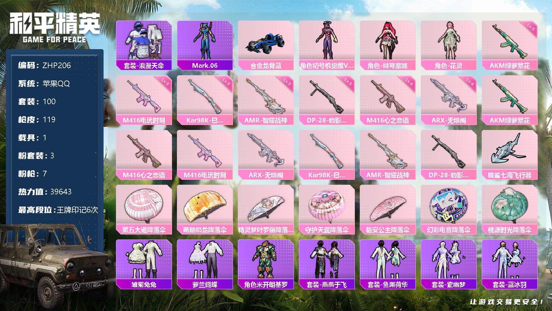 [12946943]觉醒螳螂!苹果 手Q-3粉装-7特效枪-1载具-1粉色飞行器-39643热力值-6王牌印记-100套装-119枪皮 【热门品类】:套装-浪漫天命,角色-Mark.06 【粉色载具】:合金龙骨(蓝) 【粉色套装】:角色-初号机 觉醒Ver.,角色-绯穹魔姬,角色-花灵 【粉色枪皮等级】:AKM-绿萝繁花(五级),M416-心之恋语(四级),M416-电玩时刻(五级),ARX-无垠阁(四级),Kar98K-巳巳如意(五级),AMR-智耀战神(五级),DP-28-豹影疾电(五级) 【粉色枪皮】:AKM-绿萝繁花,M416-心之恋语,M416-电玩时刻,ARX-无垠阁,Kar98K-巳巳如意,AMR-智耀战神,DP-28-豹影疾电 【粉色飞行器】:脆鲨七海飞行器 【粉色降落伞】:第五大道降落伞,萌酷奶龙降落伞,精灵梦叶罗丽降落伞,守护天翼降落伞,临安公主降落伞,幻彩电音降落伞,桃源时光降落伞 【稀有套装】:套装-雏菊兔兔,套装-萝兰蝴蝶,角色-米开朗基罗,套装-燕燕于飞,套装-鱼渊荷华,套装-紫幽梦,套装-蓝冰羽,套装-极光猎影,套装-折梦之诗,套装-朱霞炽焰,套装-凌霄紫焰 【稀有枪皮】:AKM-破晓战魂,AKM-霓虹街区,AKM-龙的传人,AKM-极光猎影,M16A4-幻世战舞者,SCAR-L-炫彩节奏,M416-糯团青竹,M416-绯红前夜,M416-蓝色火焰,AUG-天降萌叽,AUG-耀粉歌者,QBZ-彩虹符号,M762-天降萌叽,AC-VAL-天降萌叽,AC-VAL-快闪甜心,蜜獾-天降萌叽,ARX-凌霄紫焰,UZI-啾咪啾咪,UZI-天降萌叽,UMP45-涂山之恋,Vector-焰鹰斗篷,Vector-生命誓言,汤姆逊-幻星舰长,JS9-凌霄紫焰,P90-快闪甜心,M24-奇异狩猎者,AWM-焰鹰斗篷,VSS-彩虹符号,AMR-喜羊羊与灰太狼,MK20-H-快闪甜心,S686-彩虹符号,S686-生命誓言,S686-红色方程式,S12K-玩趣呆呆,S12K-夜灯,DBS-焰鹰斗篷,DBS-彩虹符号,M249-彩虹符号,M249-糯团青竹,DP-28-焰鹰斗篷,DP-28-彩虹符号,MG3-幻世战舞者,MG-36-凌霄紫焰,P92-凌霄紫焰,沙漠之鹰-快闪甜心,爆炸猎弓-喜羊羊与灰太狼,平底锅-凌霄紫焰 【其他套装】:套装-SS22特训,套装-SS23特训,套