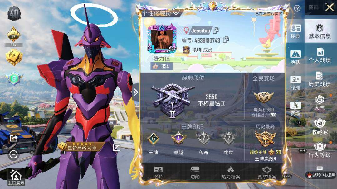 - [6260450]实名: 不可修改 时装数: 301 载具数: 2 枪械数: 102 战备数: 71 热门装扮: 深海小丑鱼,宝贝奶油派,迅捷狂鲨,沙场疾风,碧影闪光,恐龙拽拽,神秘黑猫,兔兔白日梦,音爆索尼克,女娲灵识 载具: 迈凯伦570S(天际蓝),宝马M4(圣保罗黄) 稀有枪皮: AKM炫紫旋律,SCAR-L青春物语,UMP45恐龙拽拽,Kar98K-巳巳如意,M200-伏羲圣卦