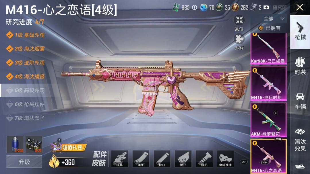 【粉色枪皮等级】:AKM-绿萝繁花(五级),M416-心之恋语(四级),M416-电玩时刻(五级),ARX-无垠阁(四级),Kar98K-巳巳如意(五级),AMR-智耀战神(五级),DP-28-豹影疾电(五级)