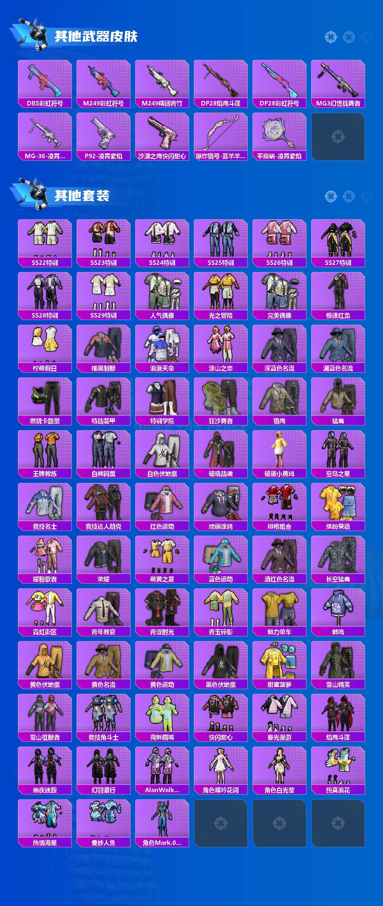 - [11937724]3特效枪 1载具 1印记 可二次 可修改实名 优质装备:兰博基尼Estoque(银翼灰),DP-28-千金淑猫,Kar98K-巳巳如意 稀有枪皮:DP-28-豹影疾电 五级特效枪:五级DP-28-千金淑猫 三级特效枪:三级Kar98K-巳巳如意 一级特效枪:一级DP-28-豹影疾电 紫色装扮:SS31特训套装,人气偶像,SS33特训套装,顶瓜瓜,萌趣颜团子,特种颜团子,SS19特训,SS17特训,冰暴轰轰,异彩先驱,SS18特训,酒红色名流,长空猛禽,霓虹极客,缤纷果语,蓝彩潮人,蓝色运动,魅力单车,黄色伏地魔,黄色名流,黄色运动,黑色伏地魔,涂山之恋,深蓝色名流,怒火燎原,战地英姿,湖蓝色名流,绮丽涂鸦,白色伏地魔,破晓战魂,破蛋小黄鸡,甜蜜告白,竞技达人朋克,红色运动,灰色格斗者,猛禽,竞技名士,SS24特训(SS24特训套装),漫步者