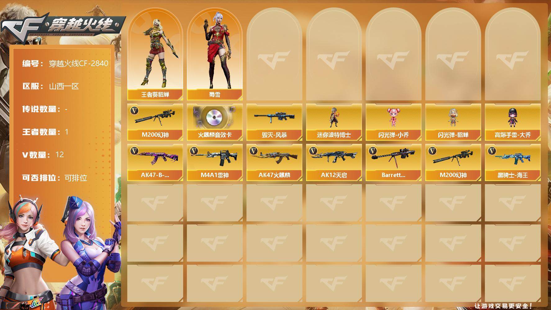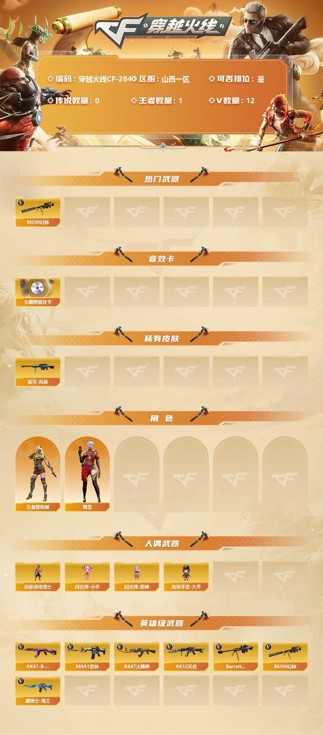 [12946072]山西一区-12V-1王者-0炫金 【热门武器】:M200-幻神 【音效卡】:AK47-火麒麟音效卡 【稀有皮肤】:毁灭-风暴 【角色】:王者-葵-貂蝉,蜀雪 【人偶武器】:迷你波特博士*2,闪光弹-小乔,闪光弹-貂蝉,高爆手雷-大乔 【英雄级武器】:M4A1-雷神*2,AK47-火麒麟,AK12-天启,Barrett-毁灭,M200-幻神,黑骑士-海王,AK47-B-常胜将军 【特殊枪械】: