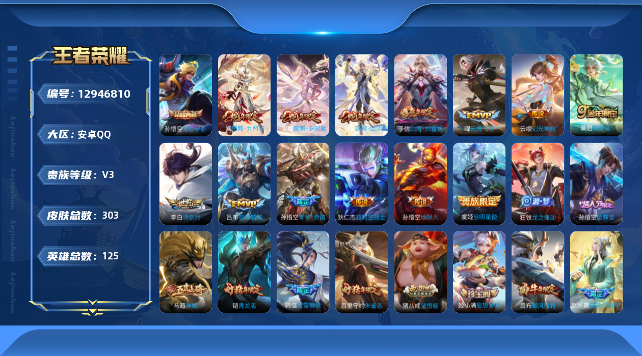 - [11553734]实名: 可修改 贵族等级: V8 英雄数: 125 皮肤数: 244 荣耀水晶: 银白咏叹调,神鉴启示录 珍品传说: 怪盗基德,器灵·落星盏 传说皮: 黄金狮子座,黄金射手座,久胜战神,末日机甲-孙尚香,胖达荣荣,乞巧织情,超时空战士-狄仁杰,无双飞将,记忆之芯,惊梅引,幻光神枪,祥瑞亨通 限定皮: 李小龙,游园惊梦,飞衡,大圣娶亲,高山流水,匿光追影者,傲雪梅枪,枫霜尽,五谷丰年,怒海麟威,山海·玄木吟,鸣野蒿,陌上桑,映山客,愿照·九州拓