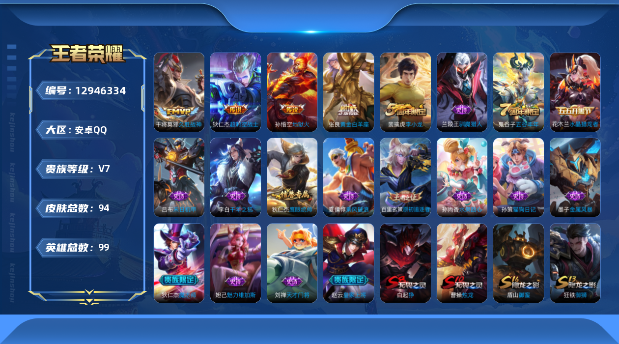 [12946334]暑期末清货/特价急出/永久包赔安卓Q-V7-尊贵铂金III段位-99英雄-94皮肤-4传说-16史诗【传说皮肤】:狄仁杰超时空战士,孙悟空地狱火,干将莫邪久胜战神,张良黄金白羊座【限定皮肤】:白起狰,狄仁杰阴阳师,虞姬凯尔特女王,赵云皇家上将,高渐离死亡摇滚,芈月重明,周瑜赤莲之焰,夏侯惇朔风刀,曹操烛龙,典韦穷奇,狄仁杰魔术师,狄仁杰万华元夜,达摩沙漠行僧,项羽海滩派对,老夫子醍醐杖,程咬金演武夺筹,兰陵王驯魔猎人,兰陵王金庭之子,牛魔御旌,李元芳云中旅人,钟馗驱傩正仪,太乙真人饕餮,太乙真人华丽摇滚,鬼谷子原初探秘者,鬼谷子五谷丰年,苏烈千军破阵,百里玄策原初追逐者,弈星混沌棋,沈梦溪大漠名商,明世隐疑决卦,裴擒虎李小龙,裴擒虎擒涛扼浪,狂铁御狮,米莱狄御霄,盾山御銮,桑启海盐诗旅