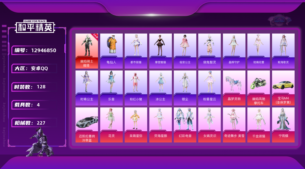 [12946850]绝世印记1【暑期末清货/特价急出/永久包赔】:安卓 手Q-1红装-22粉装-14特效枪-4载具-8.2w热力值-5印记-128套装-227枪皮【角色神装等级】:幽焰骑士-维塔(二级)【稀有载具】:宝马M4(圣保罗黄),迈凯伦塞纳(冷萃蓝),幽焰风驰摩托车,晶梦灵驹【特效枪等级】:AKM-幽焰骑士(三级),M416-风花雪月(五级),M416-灵猫魔法师(三级),汤姆逊-热量炸弹(五级),P90-金丰海韵(五级),Kar98K-巳巳如意(五级),Mk14-甜梦熊击(五级),AMR-智耀战神(四级),SVD-月影灵韵(五级),DP-28-千金淑猫(四级),DP-28-豹影疾电(五级),MG3-辉羽雀灵(三级),MG-36-幻彩电音(五级),平底锅-桃粉嫣然(二级)【优质套装】:粉装-新星烈龙,粉装-恐龙拽拽,粉装-甜梦小狐,角色-歌者泠鸢,角色-呆萌星弥,角色-小可学妹,粉装-憨憨奶龙,套装-创世·救赎,粉装-未来领航者,角色-千金淑猫,角色-信仰神谕,角色-萨利娅,角色-女娲灵识,粉装-雪月幻音,角色-智耀战神,粉装-幻彩电音,角色-时光之吻,角色-宁雨蝶,角色-荧海星豚,角色-奇迹舞步 雅雅,角色-奇迹舞步 美雪,角色-花灵【优质飞行器】:酣梦熊熊飞行器,沙丘之主天马,镜域双华-灵镜之阶,曦光华影飞行器,幽焰列车飞行器,脆鲨七海飞行器,动力核心飞行器,墨金战记飞行器,圣域金龙飞行器,终晖之翼飞行器,灵猫魔法师飞行器