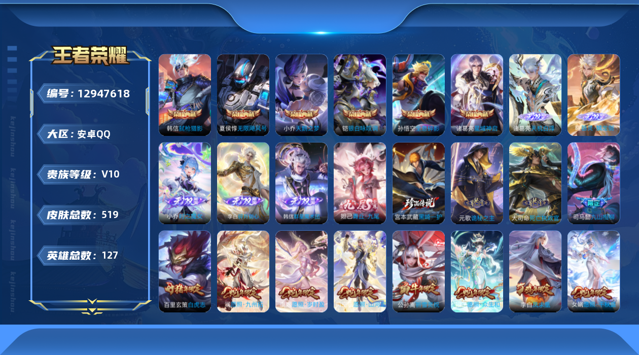 [12947618]安卓Q-V10-至尊星耀II段位-127英雄-519皮肤-6典藏-0珍品无双-6无双-1珍品传说-68传说-170史诗