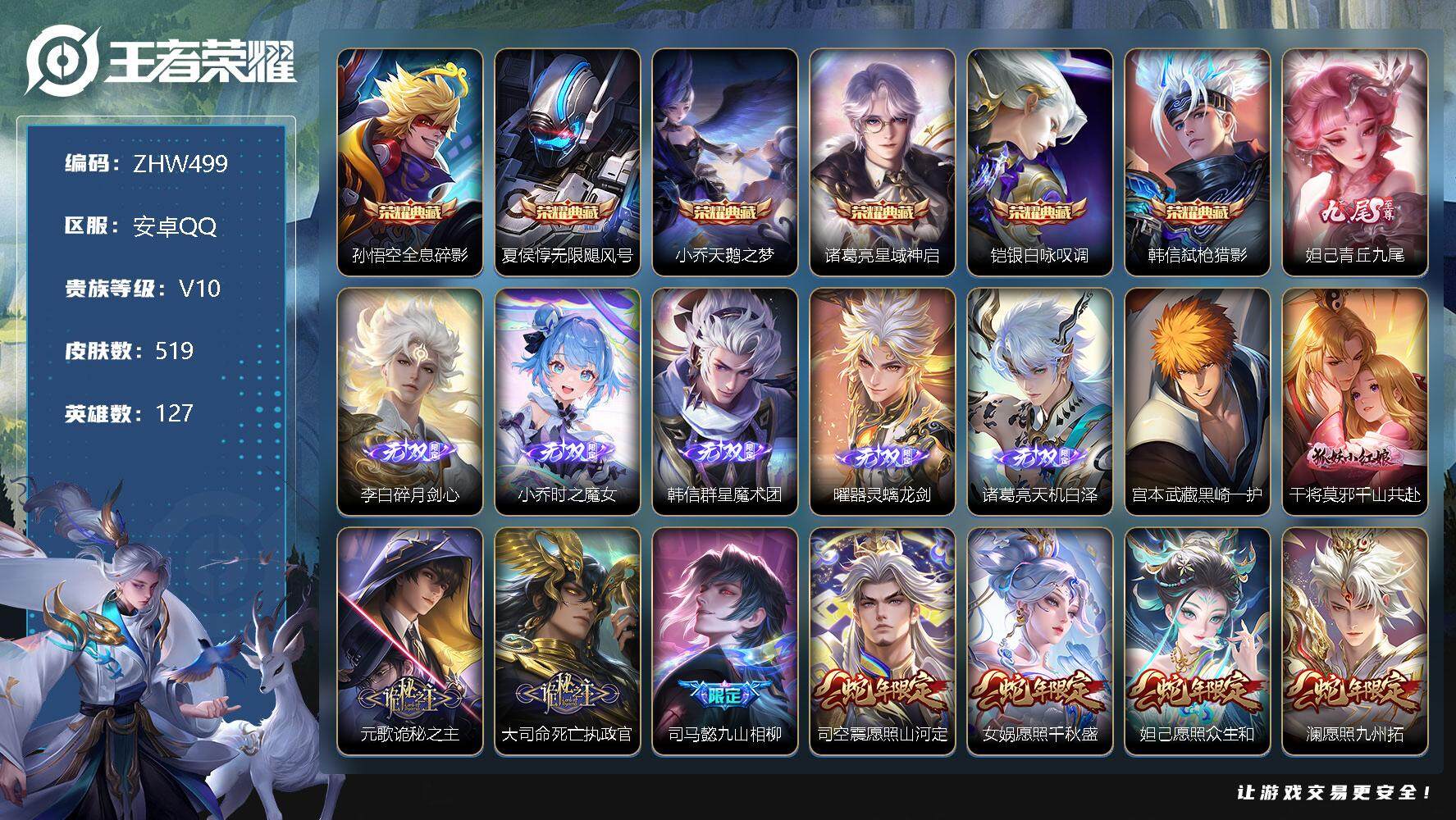 [12947618]安卓Q-V10-至尊星耀II段位-127英雄-519皮肤-6典藏-0珍品无双-6无双-1珍品传说-68传说-170史诗 【英雄全皮】:墨子全皮,高渐离全皮,阿轲全皮,钟无艳全皮,元歌全皮,典韦全皮,司马懿全皮,朵莉亚全皮,娜可露露全皮,橘右京全皮,太乙真人全皮,鬼谷子全皮,黄忠全皮,狂铁全皮,李信全皮,盾山全皮,猪八戒全皮,大司命全皮,蒙恬全皮,桑启全皮,司空震全皮,金蝉全皮,戈娅全皮,空空儿全皮,影全皮,海诺全皮,少司缘全皮 【荣耀典藏】:孙悟空全息碎影,夏侯惇无限飓风号,小乔天鹅之梦,诸葛亮星域神启,铠银白咏叹调,韩信弑枪猎影 【无双皮肤】:妲己青丘九尾,李白碎月剑心,小乔时之魔女,韩信群星魔术团,曜器灵螭龙剑,诸葛亮天机白泽 【珍品传说】:宫本武藏黑崎一护 【传说皮肤】:干将莫邪千山共赴,元歌诡秘之主,大司命死亡执政官,司马懿九山相柳,司空震愿照山河定,女娲愿照千秋盛,妲己愿照众生和,澜愿照九州拓,蔡文姬愿照福禄聚,虞姬愿照岁时盈,云缨幻光神枪,桑启鸣野蒿,朵莉亚心动手记,云中君群星魔术团,墨子黄金天蝎座,海月金乌负日,亚连落雪白狼,吕布曦玄引,貂蝉曦玄引,典韦战鼓燎原,孙尚香乘龙问璇玑,孙策乘龙淬吴钩,赵云乘龙铭钟鼎,马超琥珀纪元,铠琥珀纪元,艾琳觅芳踪,孙膑小动物乐团,狄仁杰夜礼服假面,王昭君永恒水手月亮,东皇太一灼幽烈阳,澜电玩雷克斯,李信山海炽霜斩,吕布怒海麟威,李白诗剑行,狄仁杰神器狴犴令,不知火舞绯月行,百里守约碎云,橘右京枫霜尽,娜可露露前尘镜,孙策末日机甲,裴擒虎寅虎赤拳,赵云淬星耀世,王昭君乞巧织情,西施游龙清影,李元芳飞鸢探春,公孙离祈雪灵祝,铠绛天战甲,镜炽阳神光,虞姬启明星使,曜云鹰飞将,李信一念神魔,刘备时之恋人,伽罗太华,貂蝉猫影幻舞,张良黄金白羊座,干将莫邪久胜战神,虞姬云霓雀翎,达摩黄金狮子座,百里玄策白虎志,花木兰冠军飞将,后羿黄金射手座,杨戬永曜之星,诸葛亮武陵仙君,李白凤求凰,孙尚香末日机甲,宫本武藏地狱之眼,孙悟空地狱火,吕布天魔缭乱 【限定皮肤】:白起狰,蔡文姬夏日便利店,大乔绒语心约,虞姬夏日便利店,姜子牙天穹之誓,狄仁杰阴阳师,廉颇寅虎御盾,赵云皇家上将,赵云引擎之心,墨子神迹守卫,墨子降魔,妲己时之奇旅,嬴政优雅恋人,嬴政白昼王子,鲁班七号狮舞东方,庄周云端筑梦师,庄周玄嵩,庄周高山流水,高渐离死亡摇滚,高渐离