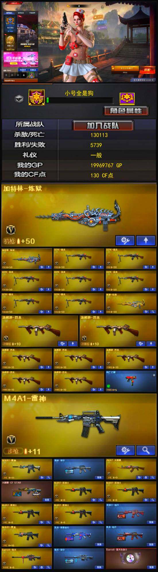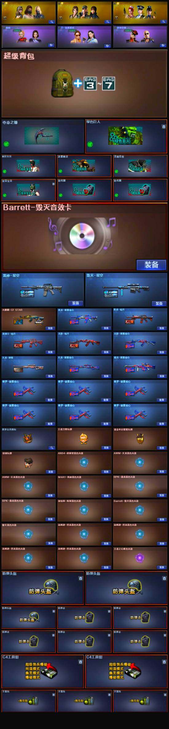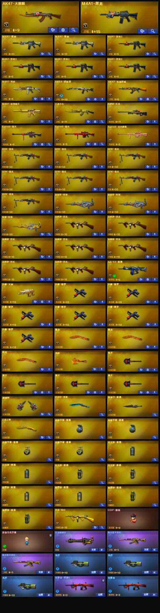 【英雄级武器】:AK47-火麒麟,M4A1-黑龙,M4A1-雷神*2,M4A1-黑骑士*4,M4A1-死神,AN94-超新星,AK47-机械迷城,M4A1-玫瑰精灵,AWM-天龙,Barrett-毁灭,Barrett-极光,RPK-盘龙*7,加特林-炼狱*2,汤姆逊-烈龙*7,AA-12-雷霆,沙鹰-修罗*6,沙鹰-天神,屠龙*3,龙啸,擎天*4,麒麟刺,斩神刀-雷暴