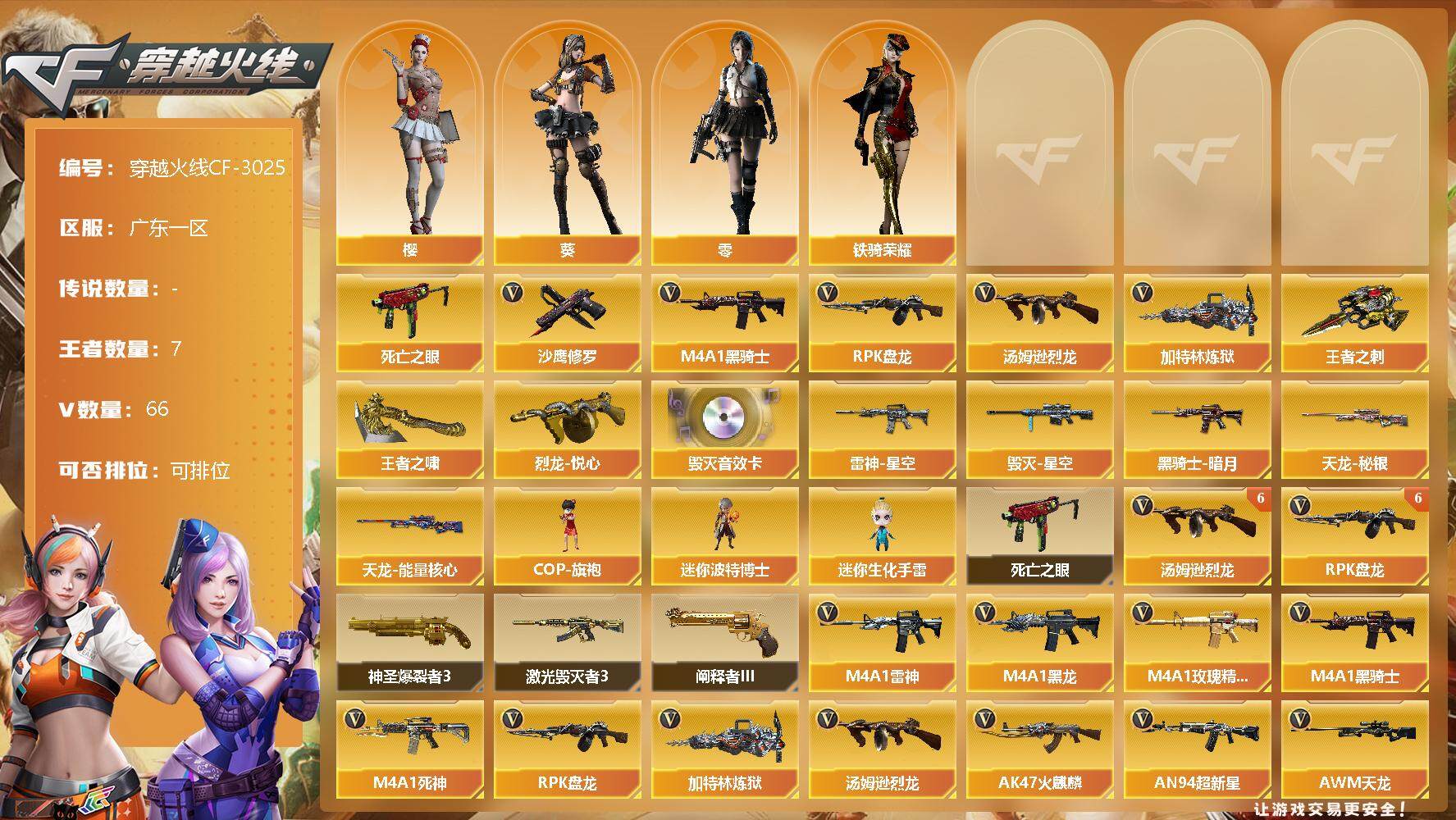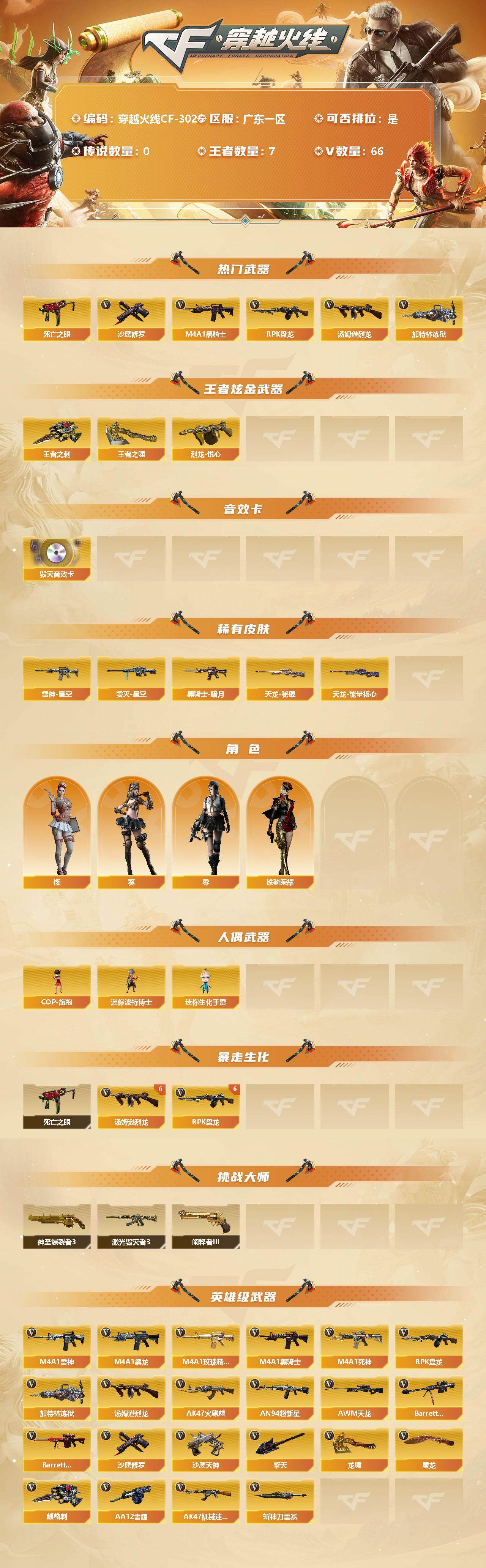 [12947628]广东一区-66V-7王者-0炫金 【热门武器】:死亡之眼,M4A1-黑骑士*4,汤姆逊-烈龙*7,RPK-盘龙*7,加特林-炼狱*2,沙鹰-修罗*6 【王者炫金武器】:烈龙-悦心,王者之刺*2,王者之啸 【音效卡】:Barrett-毁灭音效卡 【稀有皮肤】:雷神-星空,黑骑士-暗月,毁灭-星空,天龙-秘银,天龙-能量核心 【角色】:零,葵,樱,铁骑荣耀 【人偶武器】:COP-旗袍,迷你波特博士*2,迷你生化手雷 【暴走生化】:死亡之眼 【挑战大师】:神圣爆裂者III,阐释者III,激光毁灭者III*2 【英雄级武器】:AK47-火麒麟,M4A1-黑龙,M4A1-雷神*2,M4A1-黑骑士*4,M4A1-死神,AN94-超新星,AK47-机械迷城,M4A1-玫瑰精灵,AWM-天龙,Barrett-毁灭,Barrett-极光,RPK-盘龙*7,加特林-炼狱*2,汤姆逊-烈龙*7,AA-12-雷霆,沙鹰-修罗*6,沙鹰-天神,屠龙*3,龙啸,擎天*4,麒麟刺,斩神刀-雷暴 【特殊枪械】:4黑骑士,6烈龙,6盘龙,2炼狱