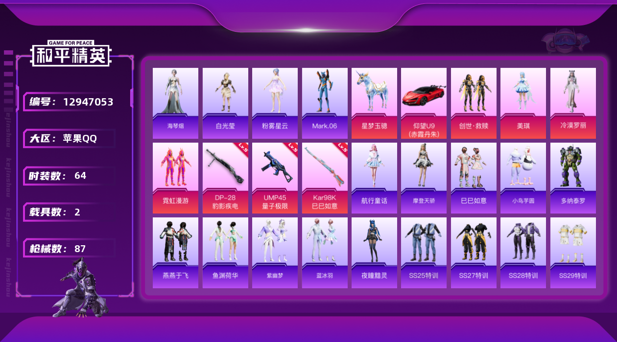 [12947053]连体王者166皮19传说【暑期末清货/特价急出/永久包赔】:苹果 手Q-4粉装-3特效枪-2载具-2.8w热力值-2印记-64套装-87枪皮【稀有载具】:仰望U9(赤霞丹朱),星梦玉骢【特效枪等级】:UMP45-量子极限(五级),Kar98K-巳巳如意(五级),DP-28-豹影疾电(五级)【优质套装】:角色-美琪,粉装-霓虹漫游,套装-创世·救赎,角色-冷漠罗丽【优质飞行器】:鎏金朋克飞行器,龙翔九天飞行器,月下星之子飞行器