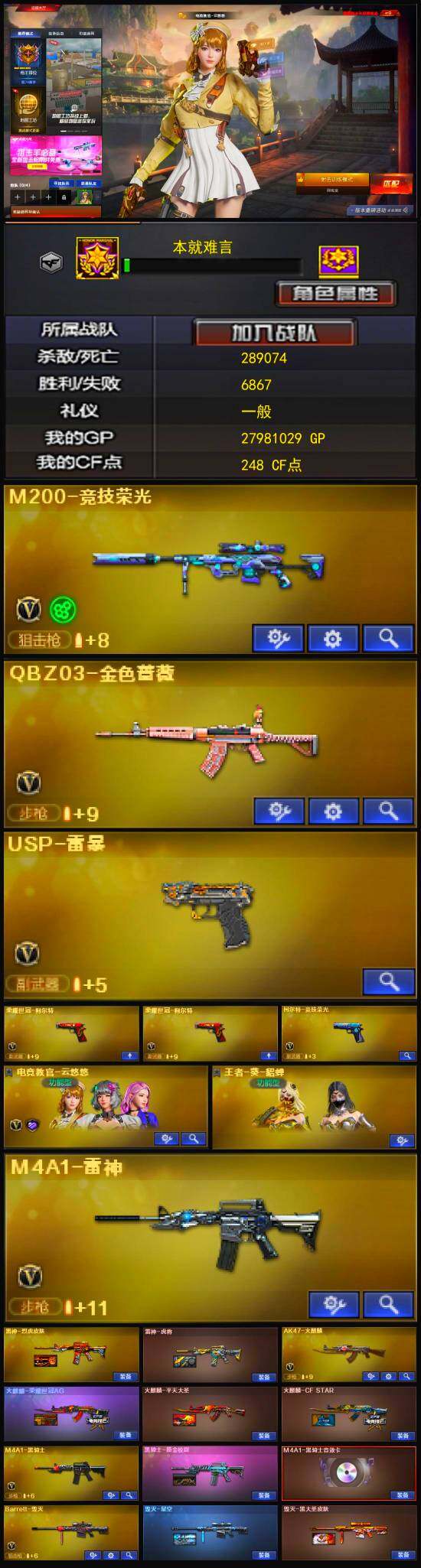【热门武器】:QBZ03-金色蔷薇,M200-竞技荣光,荣耀世冠-柯尔特*2,M4A1-黑骑士,USP-雷暴,沙鹰-修罗,荣耀世冠-龙啸