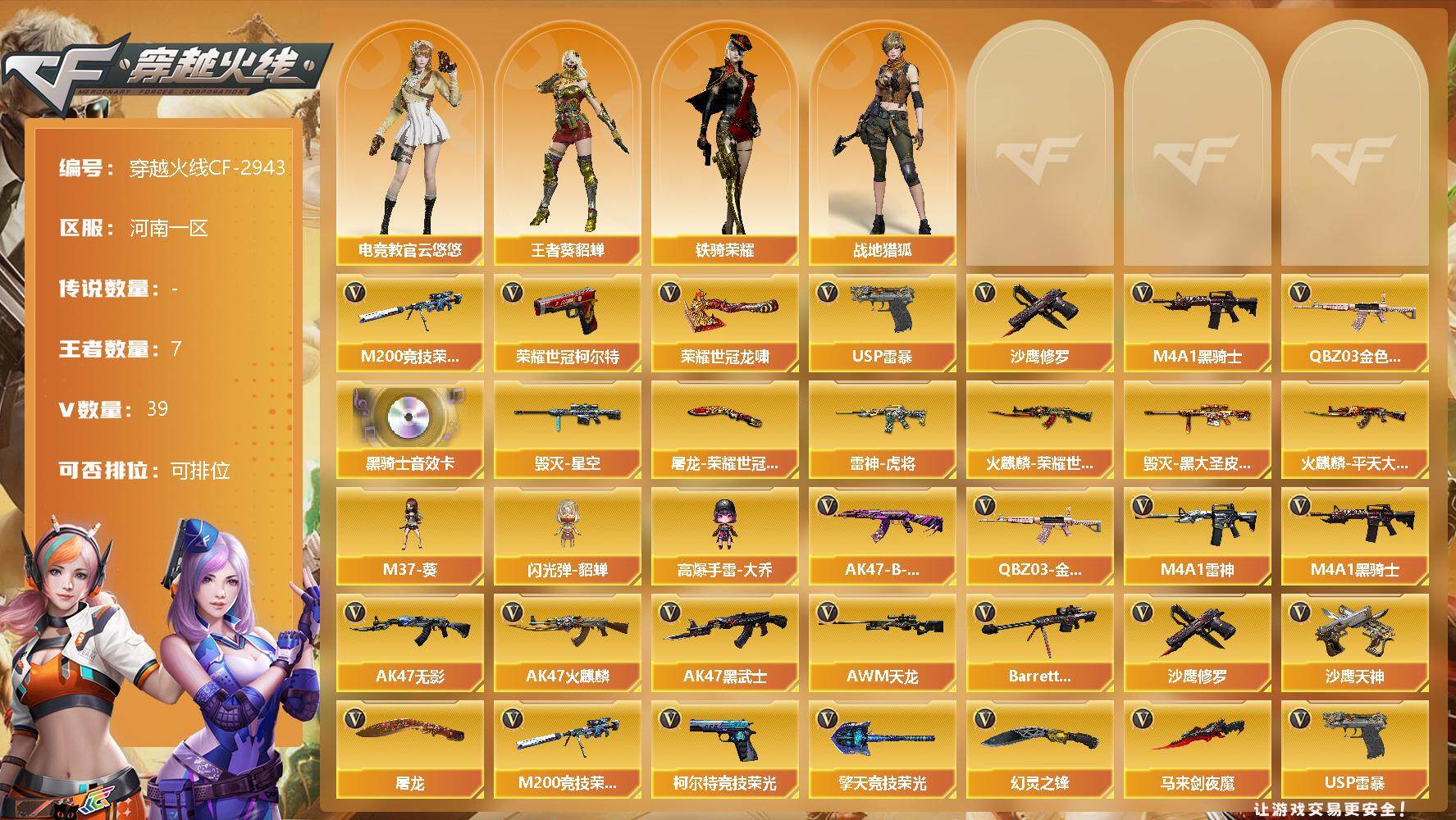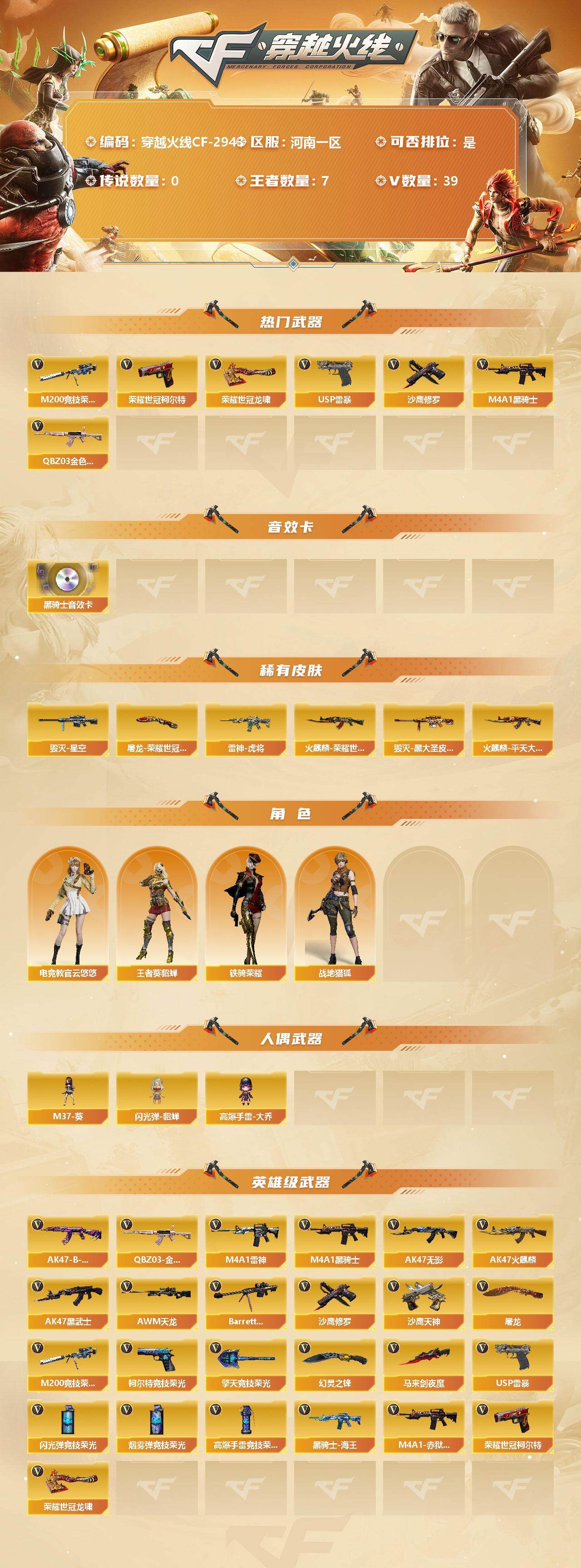 [12946755]河南一区-39V-7王者-0炫金 【热门武器】:QBZ03-金色蔷薇,M200-竞技荣光,荣耀世冠-柯尔特*2,M4A1-黑骑士,USP-雷暴,沙鹰-修罗,荣耀世冠-龙啸 【音效卡】:M4A1-黑骑士音效卡 【稀有皮肤】:雷神-虎将,火麒麟-平天大圣,火麒麟-荣耀世冠AG,毁灭-星空,毁灭-黑大圣皮肤,屠龙-荣耀世冠AG*2 【角色】:王者-葵-貂蝉,电竞教官-云悠悠,战地猎狐,铁骑荣耀 【人偶武器】:M37-葵,闪光弹-貂蝉,高爆手雷-大乔 【英雄级武器】:M200-竞技荣光,柯尔特-竞技荣光,擎天-竞技荣光,高爆手雷-竞技荣光*2,烟雾弹-竞技荣光*2,闪光弹-竞技荣光*2,幻灵之锋,马来剑-夜魔,USP-雷暴,荣耀世冠-柯尔特*2,荣耀世冠-龙啸,QBZ03-金色蔷薇,M4A1-雷神,M4A1-黑骑士,AK47-无影,AK47-火麒麟,AK47-黑武士,AWM-天龙,Barrett-毁灭,黑骑士-海王,AK47-B-常胜将军,M4A1-赤狱骑士,沙鹰-天神,沙鹰-修罗,屠龙 【特殊枪械】:1黑骑士