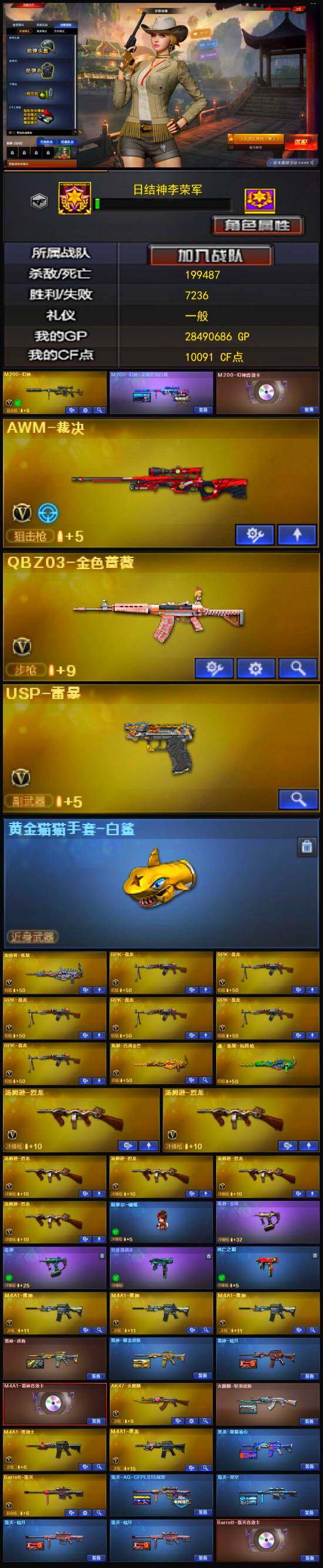 【热门武器】:QBZ03-金色蔷薇,M200-幻神,死亡之眼,毒蜂,M4A1-黑骑士,汤姆逊-烈龙*6,RPK-盘龙*6,加特林-炼狱,斯泰尔-蝴蝶,USP-雷暴,沙鹰-修罗*5,黄金猫猫手套-白鲨